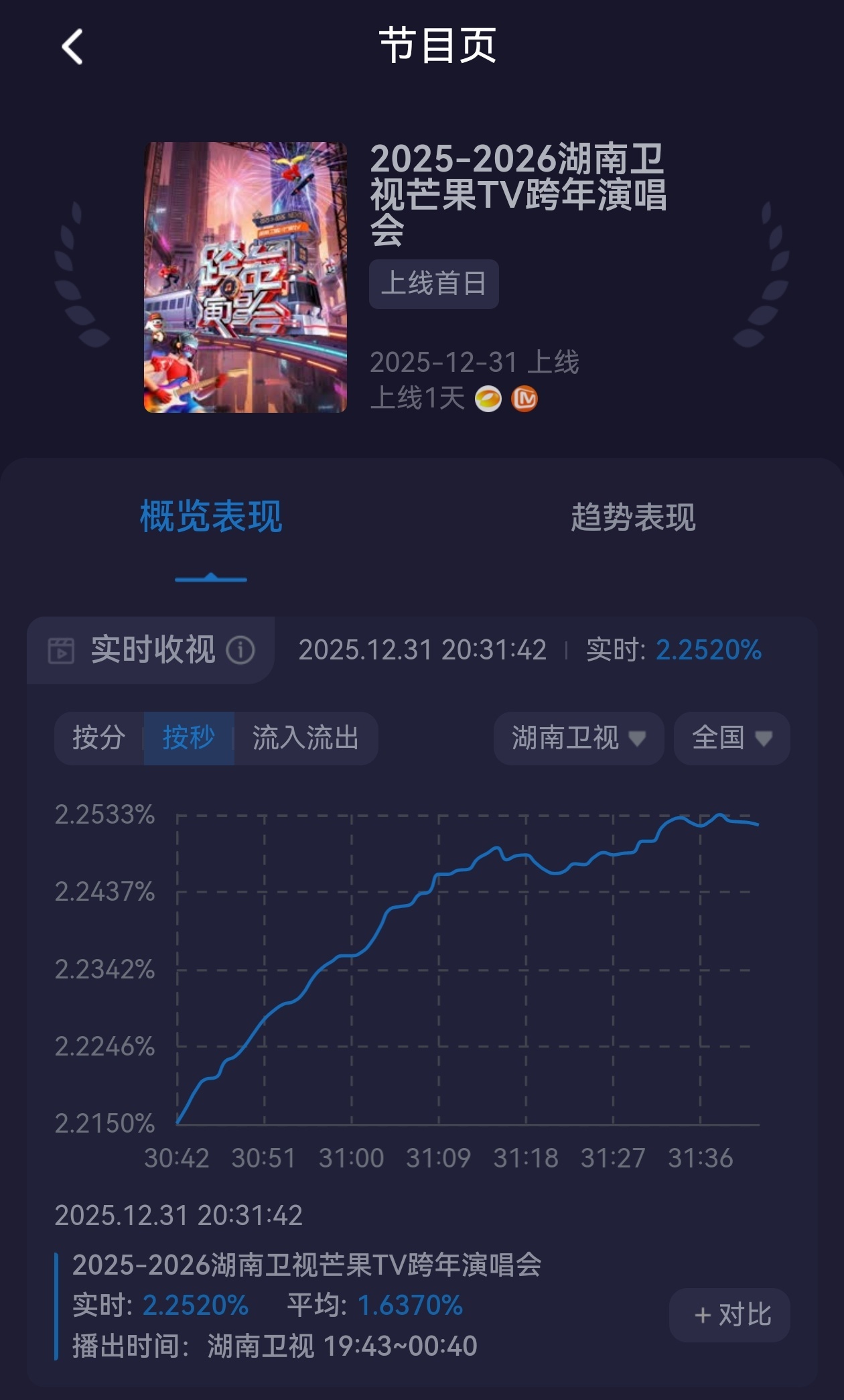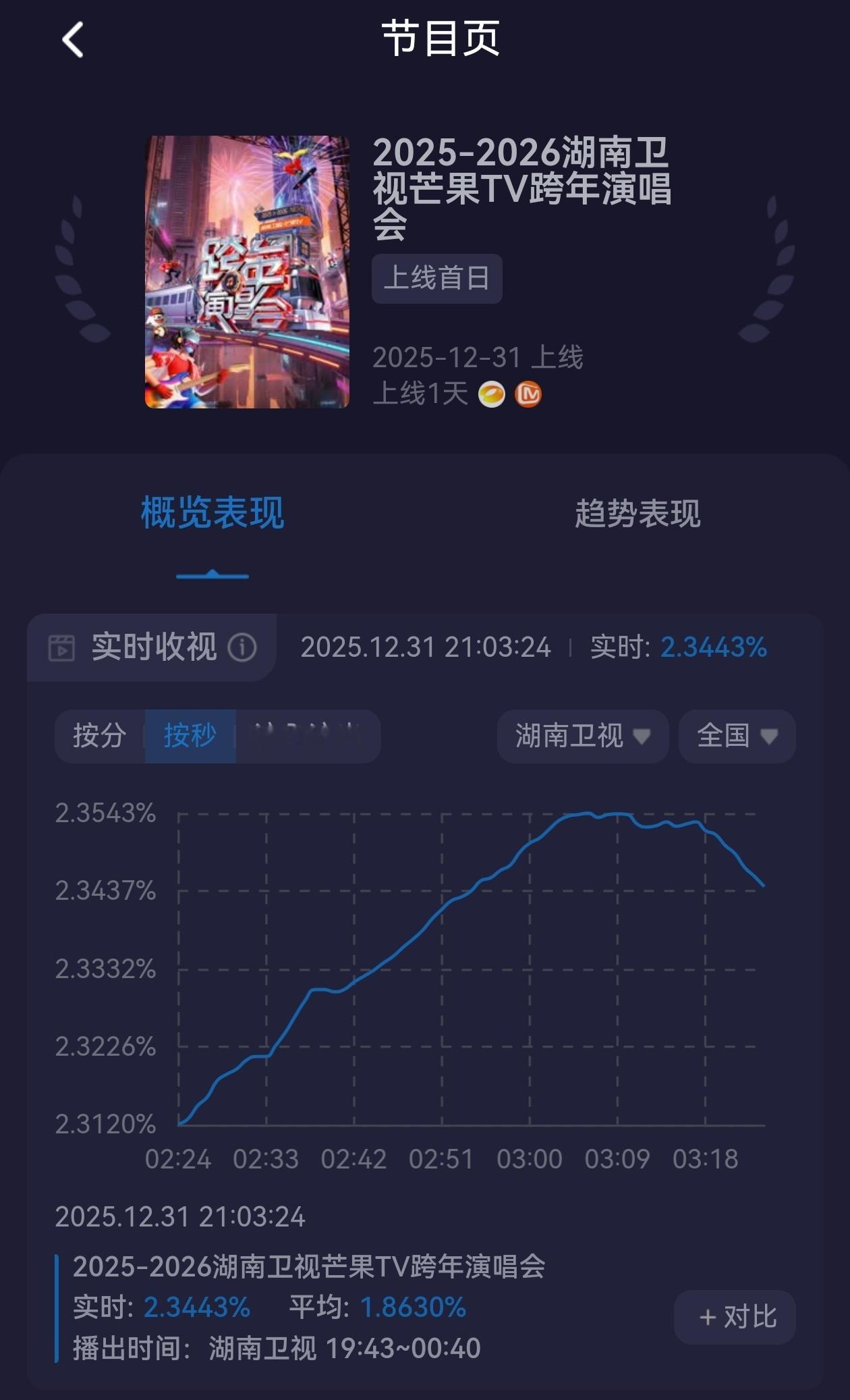 湖南卫视跨年演唱会完美结束。今晚最高收视率峰值2.46+由倪萍带领众人合体表演《春晚回忆花车串烧》拿下!第二峰值收视率2.39+由王心凌六分钟唱跳串烧在《彩虹的微笑》拿下。第三峰值收视率2.35+由徐佳莹、戴佩妮、郭静、谭松韵、沈月、王楚然合唱《想见你想见你想见你》拿下。最佳亮点:邓超全开麦真唱唱跳10分钟《超级英雄+饿狼传说+音浪》嗨爆全场,收视率达到2.25+,一举打破去年最高收视峰值2.24+。