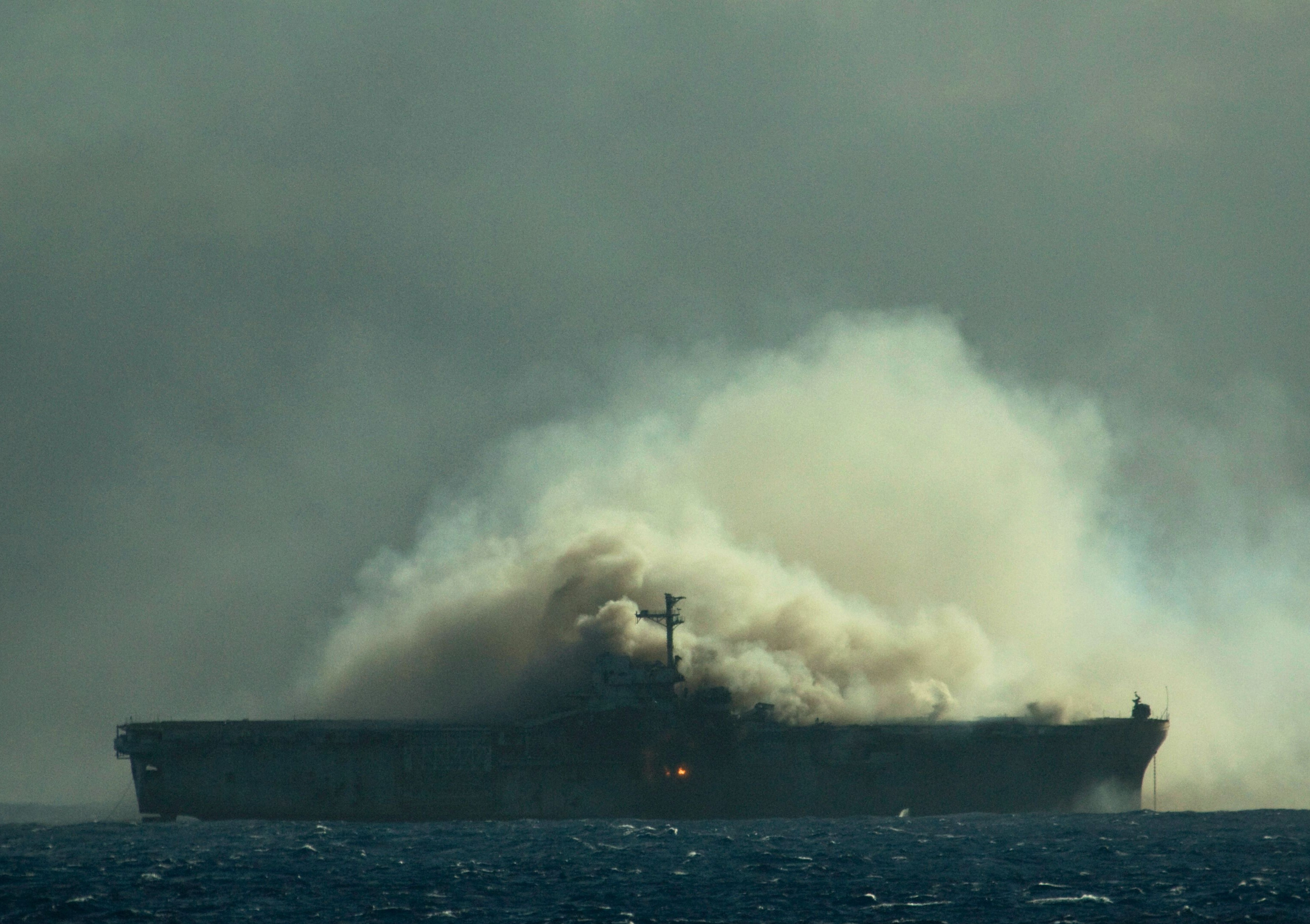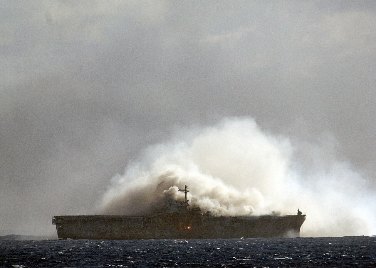 2010年环太平洋军演。退役的硫磺岛级两栖攻击舰新奥尔良号USS New Orleans(ex LPH-11)被作为靶舰击沉
