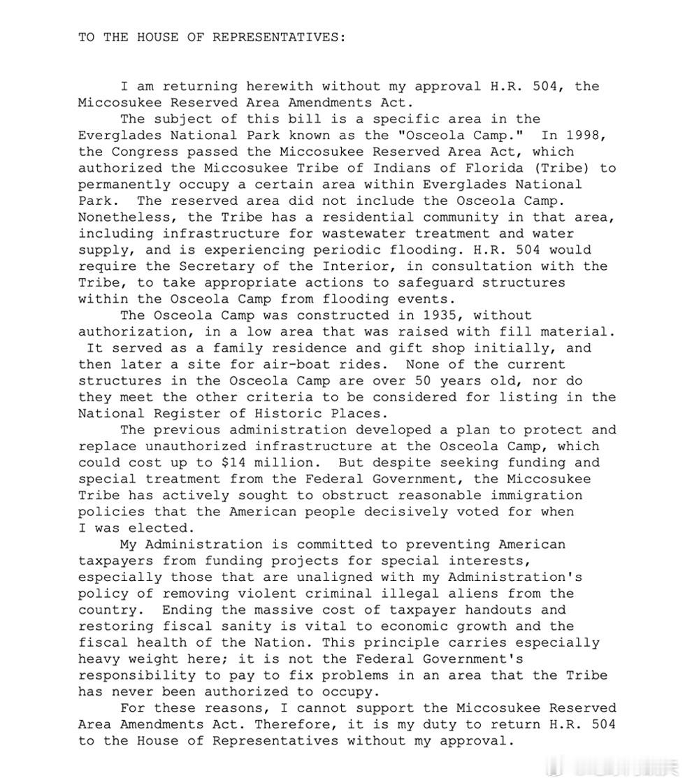 ‼️特朗普总统否决了 HR 131 号法案(《完成阿肯色河谷输水管道法案》)和 HR 504 号法案(《米科苏基保留区修正案》)。他已将附件中的信息转发给国会。热点现场海外编译精选海外新鲜事