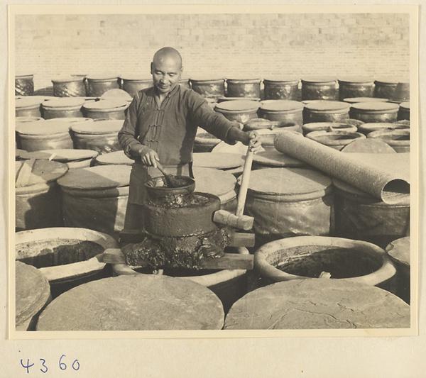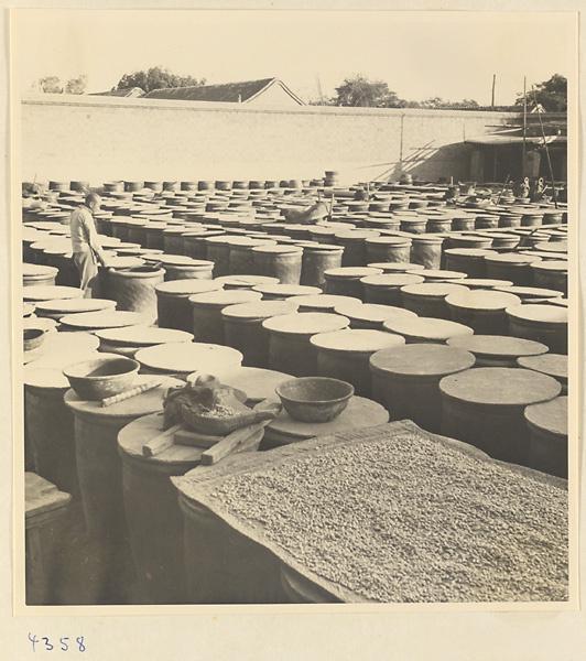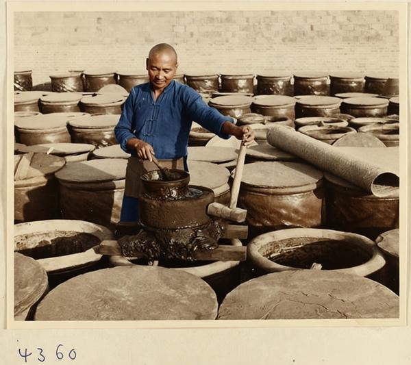 这三张老照片(编号4358、4360、4359)拍摄于民国时期,记录了河北保定传统酱菜制作工厂(酱园)的生产场景。照片显示一个露天或半露天的大院落,地面铺砖或土,院内密密麻麻排列着数百口大型陶制酱缸(大口缸),缸口覆盖圆形盖子,用于发酵酱料或腌制酱菜。工人身着中式短褂或长衫,头剃光头,手工操作。 民国时期,保定酱业极为发达,以“槐茂酱园”为代表,与北京“六必居”等并称“江北四大酱园”。槐茂创立于清康熙十年(1671年),专营甜面酱和酱腌菜,到民国时期保定酱园达80余家,大缸数万口,年产面酱、数百万斤,酱菜品种达数十种(如春不老、酱瓜、酱八宝等)。 保定有民谣“保定府三宗宝:铁球、面酱、春不老”,其中面酱和春不老(一种酱雪里蕻)皆出自酱园,槐茂独占两宝。传统工艺依赖天然发酵:面粉蒸熟制曲、入缸加盐水日晒数月成甜面酱,再用酱汁腌制蔬菜,需大量露天大缸曝晒搅拌,故照片中缸阵景象典型。
