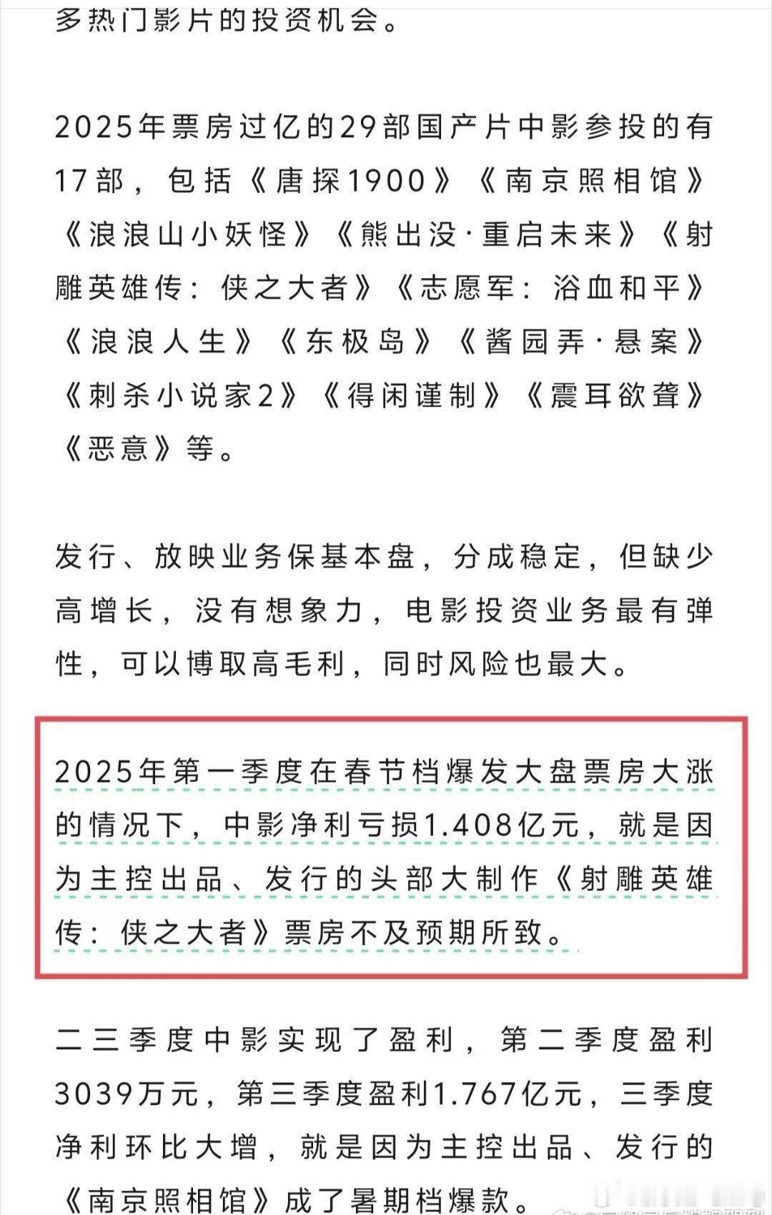 狐厂娱乐观察发文…在春节档大盘暴涨的情况下,中影刨去盈利依旧亏损1.408亿,主要原因是肖战射雕英雄传票房不及预期…