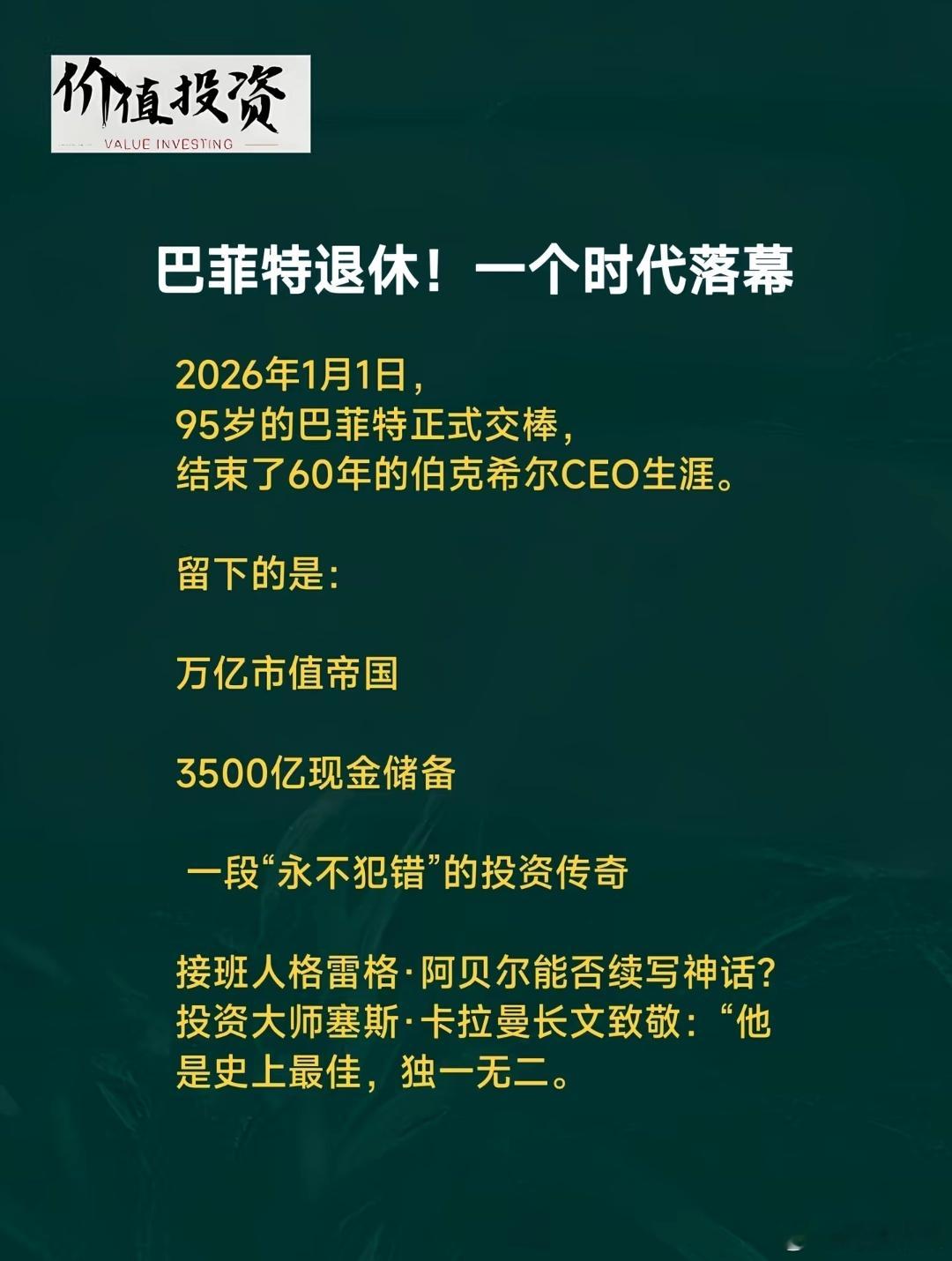2025年收官:巴菲特正式退休,全球顶级富豪财富暴增2.2万亿美元执掌美国投资公司伯克希尔·哈撒韦多年的著名投资家沃伦·巴菲特(95岁)将于12月31日卸任CEO一职。“投资之神”巴菲特的卸任给市场留下了不安,其继任者副董事长格雷格·阿贝尔的能力备受关注。巴菲特在2025年5月的年度股东大会上宣布将卸任CEO,但仍将担任董事长。巴菲特巴菲特