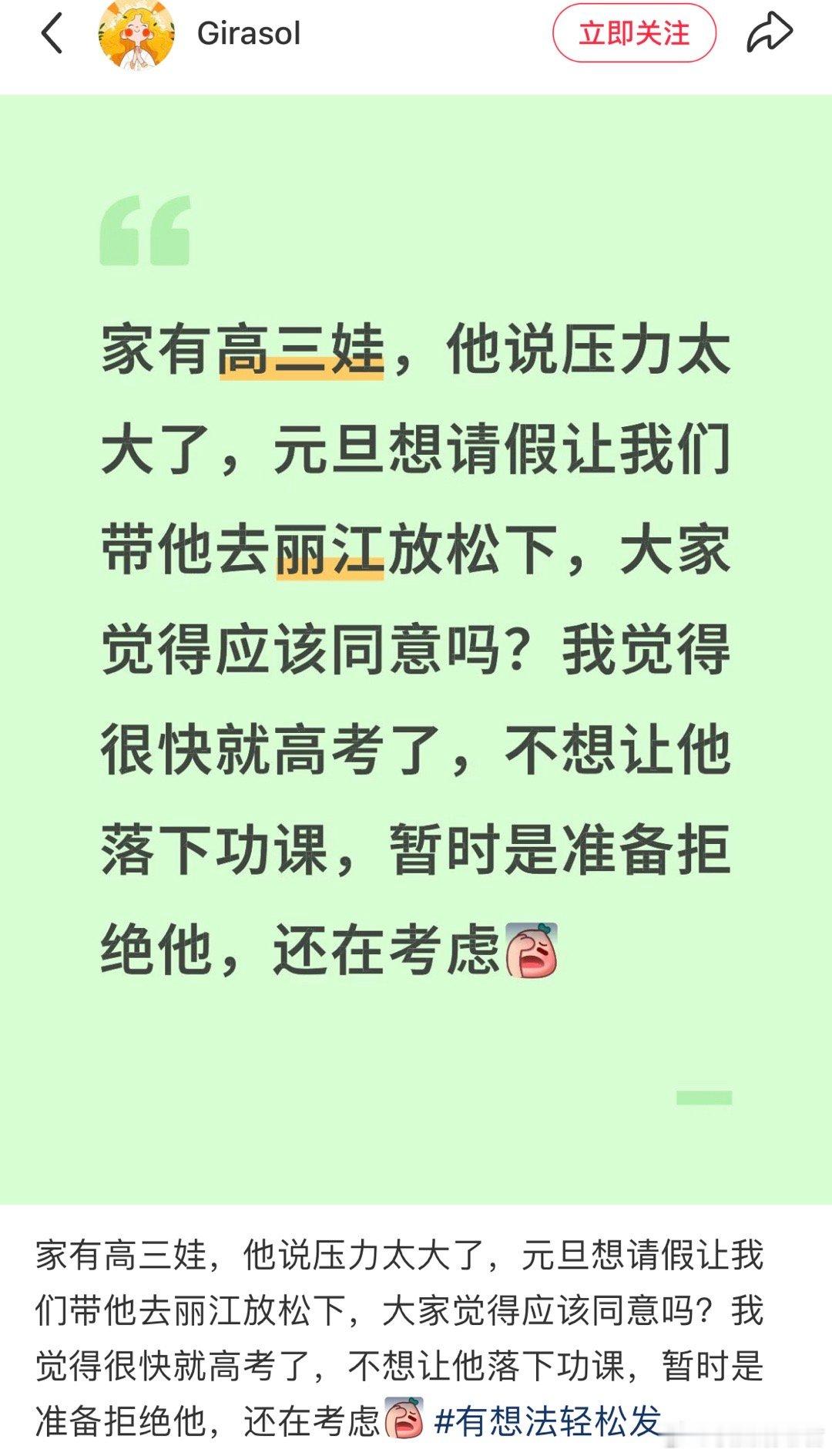 家有高三娃,他说压力太大了,元旦想请假让我们带他去丽江放松下,大家觉得应该同意吗?
