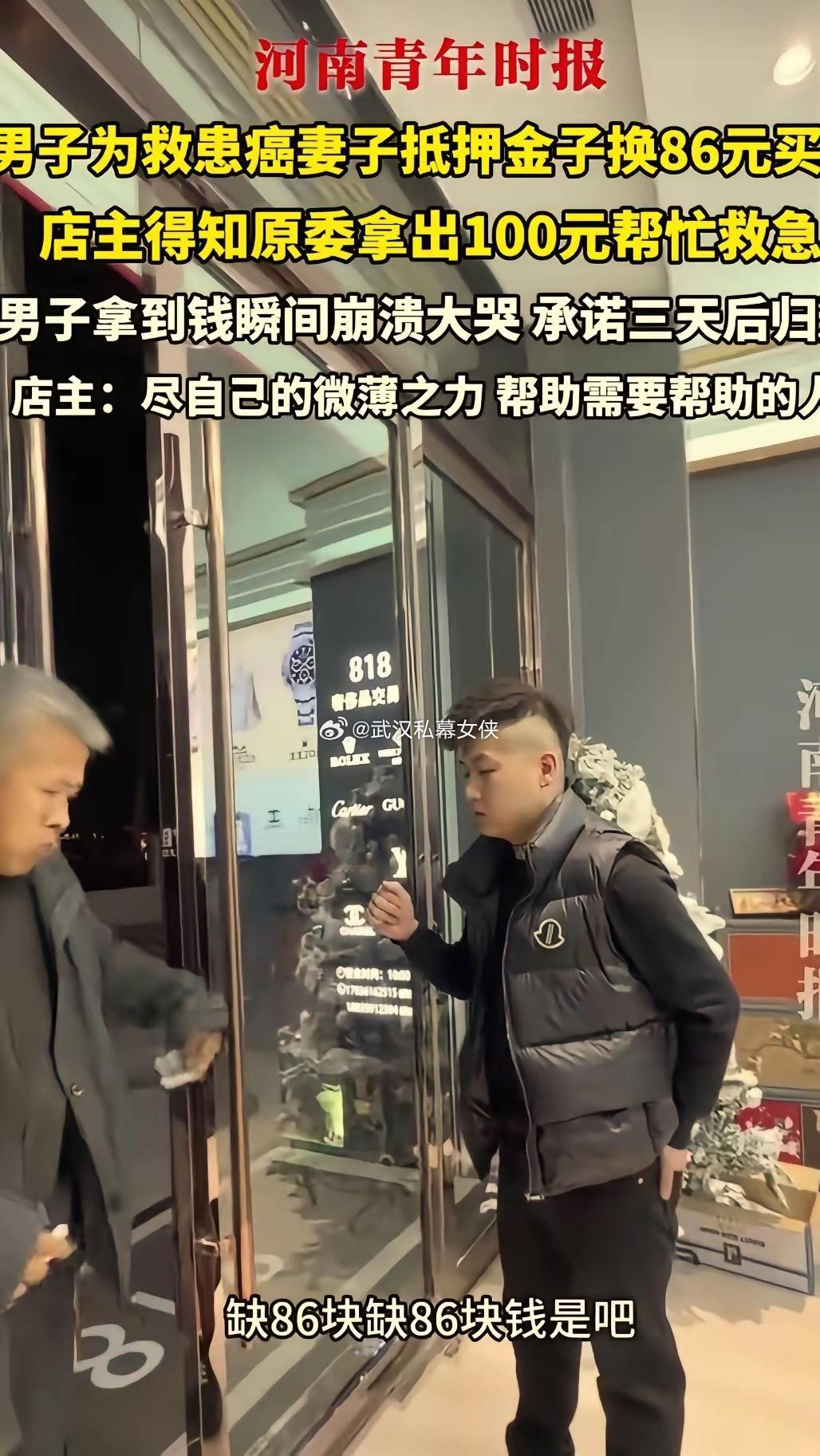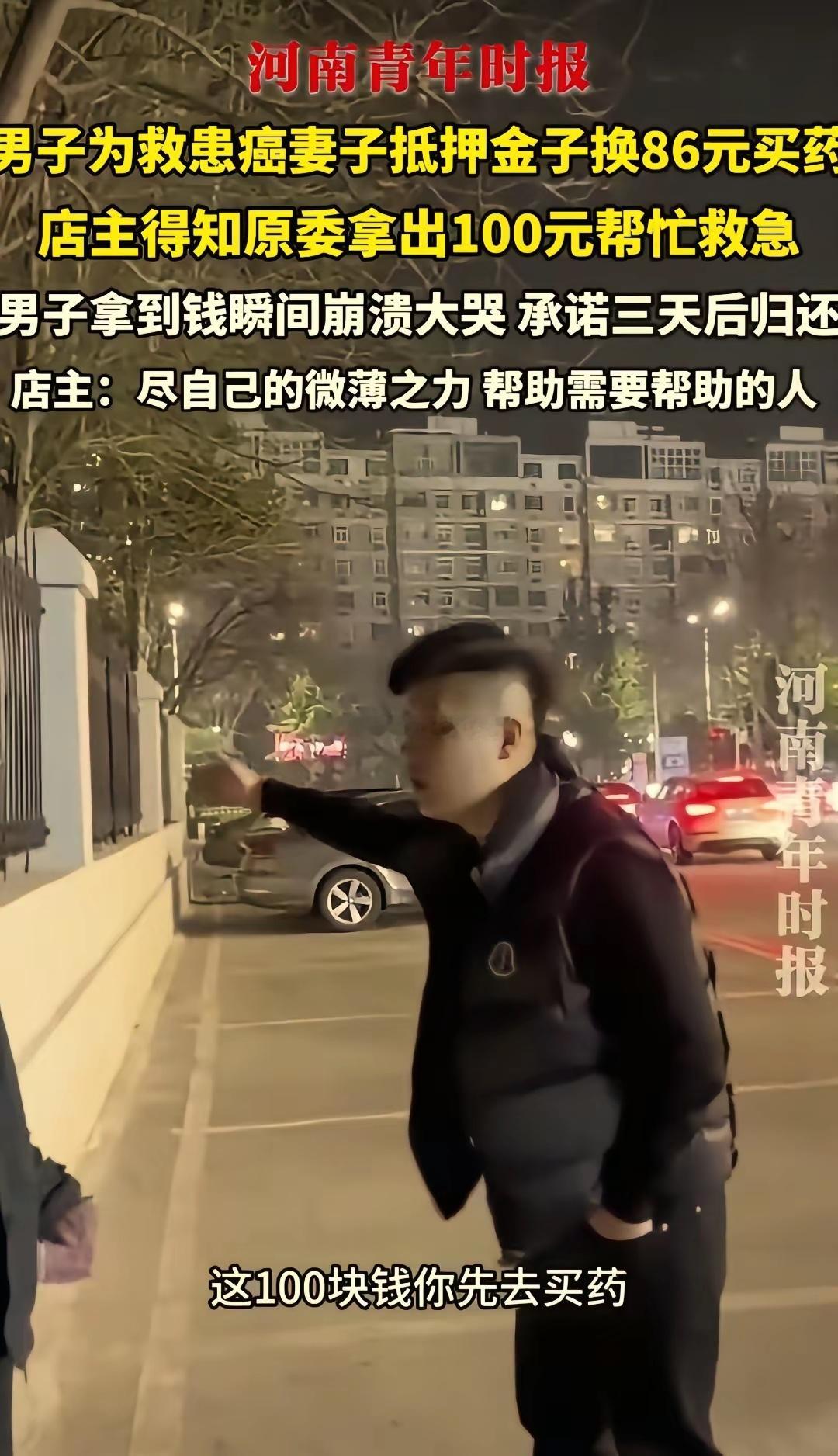 “看哭了!”山西,一大哥在某店面门口徘徊半天,终于鼓起勇气请求店主:“我不要钱,你帮我妻子买个药,好吗?”见店主似信非信,大哥赶忙掏出金子要抵给店主,还哽咽着说就差86元。没想到店主接下来一句话,直接让大哥泪目了。店主本来以为是骗子或者什么要钱的套路,结果听到大哥磕磕巴巴说出有零有整的钱数,心都跟着揪了一下。根据河南青年时报报道,这件让人破防的事,就发生在一家店面门口。店主透露,当时大哥挤着玻璃门站在门口,格外紧张和局促,听到想抵金子为妻子买药时,店主一脸难以置信,再看到大哥掏出自己仅有的钱数了一下后告诉他:“差86块钱。”店主心里十分不是滋味。店主马上提出:“我不要你金子,什么也不用,我免费帮你买。”没想到大哥怕欠人情,连声拒绝,就要往外走。结果店主立刻追了出去,掏出100块钱,塞在了他手里:“你先去买药,过两天等你有了钱再还给我,我的店就在这儿。”大哥攥紧了钱,一抬手就开始擦眼睛,当场哭出了声:“不好意思,太不好意思了。”店主赶紧劝:“人都有难处的,别难过,快去买药吧。”大哥千恩万谢的离开了,本以为大哥有难处,店主这钱也不打算要了,没想到三天后,大哥拿着100块钱主动还给了店主。店主把事情发到了网上,还说:“能帮一把是一把。”有网友说:一定要给这店主点个赞,这样的老板生意不会差。这事看的人心酸又温暖,店主没有嫌麻烦,一句暖心话就解了别人的燃眉之急,关键时刻的援手,真的能救一个家。谁还没个有难处的时候呢?希望大家多一份体谅,少一份猜忌。在这里也不得不说,店主的格局太赞了,愿这份善良能一直传递下去,也希望大哥的妻子早日康复。