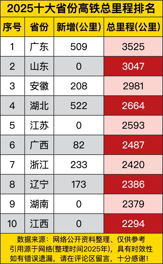 广东那可是相当霸气,直接以3525公里的总里程一骑绝尘。新增的509公里更是给它添了一把火,就像一位超级选手,在赛道上一路狂飙。这速度,其他省份可得加把劲儿追了,不然可就被落下老远咯! 再看山东和江苏,总里程分别是3047公里和2593公里,可新增里程却是0。这就好比两位稳重的选手,虽然不着急冲刺新里程,但人家底子厚啊。不过,也别光吃老本,万一被后面的弯道超车了,那可就尴尬啦!得时刻准备着发力才行呢。 湖北和安徽这两位选手也不容小觑。湖北总里程2664公里,新增522公里;安徽总里程2981公里,新增208公里。它们就像是赛场上的潜力股,不断努力增加自己的里程数。尤其是湖北,这新增的劲头很猛,说不定哪天就能和前面的选手掰掰手腕啦! 最后看看广西、浙江、辽宁等省份。它们虽然没有前面几位那么亮眼,但也在一步一个脚印地前进。广西新增82公里,浙江新增233公里……它们的进步虽然看似不大,但积少成多嘛。说不定未来某一天,就能给咱们带来大大的惊喜,让我们拭目以待吧!