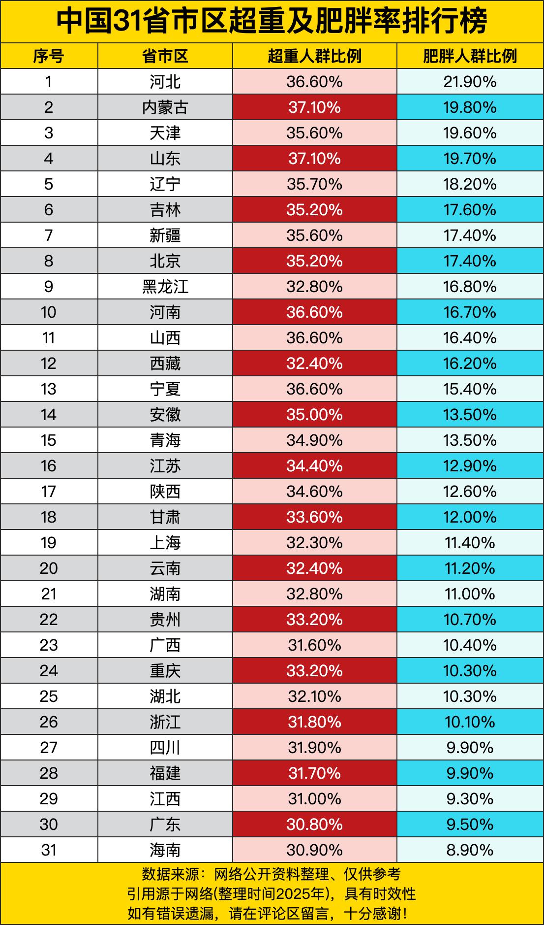 河北以36.60%的超重人群比例拔得头筹,内蒙古更是厉害,37.10%的超重率和19.80%的肥胖率,直接在肥胖界“崭露头角”。这数据一摆出来,感觉这些地方的街头巷尾都飘着“幸福肥”的味道了。也不知道是不是当地的美食太有诱惑力,把大家都给“喂”胖啦。 再看天津和山东,超重率也都高达35.60%和37.10%,肥胖率也不低。这俩地方的朋友,是不是平时撸串、煎饼果子、大葱蘸酱吃得太欢,运动却没跟上呀?不过话说回来,这也从侧面反映出当地的生活水平不错,想吃啥有啥。但咱也不能光享受美食,不顾身材呀,不然这体重秤上的数字可就要一路狂飙啦。 让人意外的是,一些印象中比较“苗条”的地方,超重和肥胖率也不容小觑。比如上海,超重率32.30%,肥胖率11.40%;北京超重率35.20%,肥胖率17.40%。作为一线城市,生活节奏快,压力也大,难道大家都靠胡吃海塞来缓解压力?还是说在高楼大厦间,运动的机会太少了?看来在大城市生活,不仅要应对工作上的挑战,还得和体重“斗智斗勇”呢。 最让人欣慰的是海南,超重率30.90%,肥胖率8.90%,在这份榜单里算是“清流”了。难道是海南的阳光、沙滩和海风太迷人,让大家更愿意去户外活动,保持健康的生活方式?还是说椰子鸡、清补凉这些美食热量没那么高?不管怎样,海南的小伙伴们在这方面确实值得点赞,希望其他地方的朋友也能动起来,别让体重成为健康的负担哟!