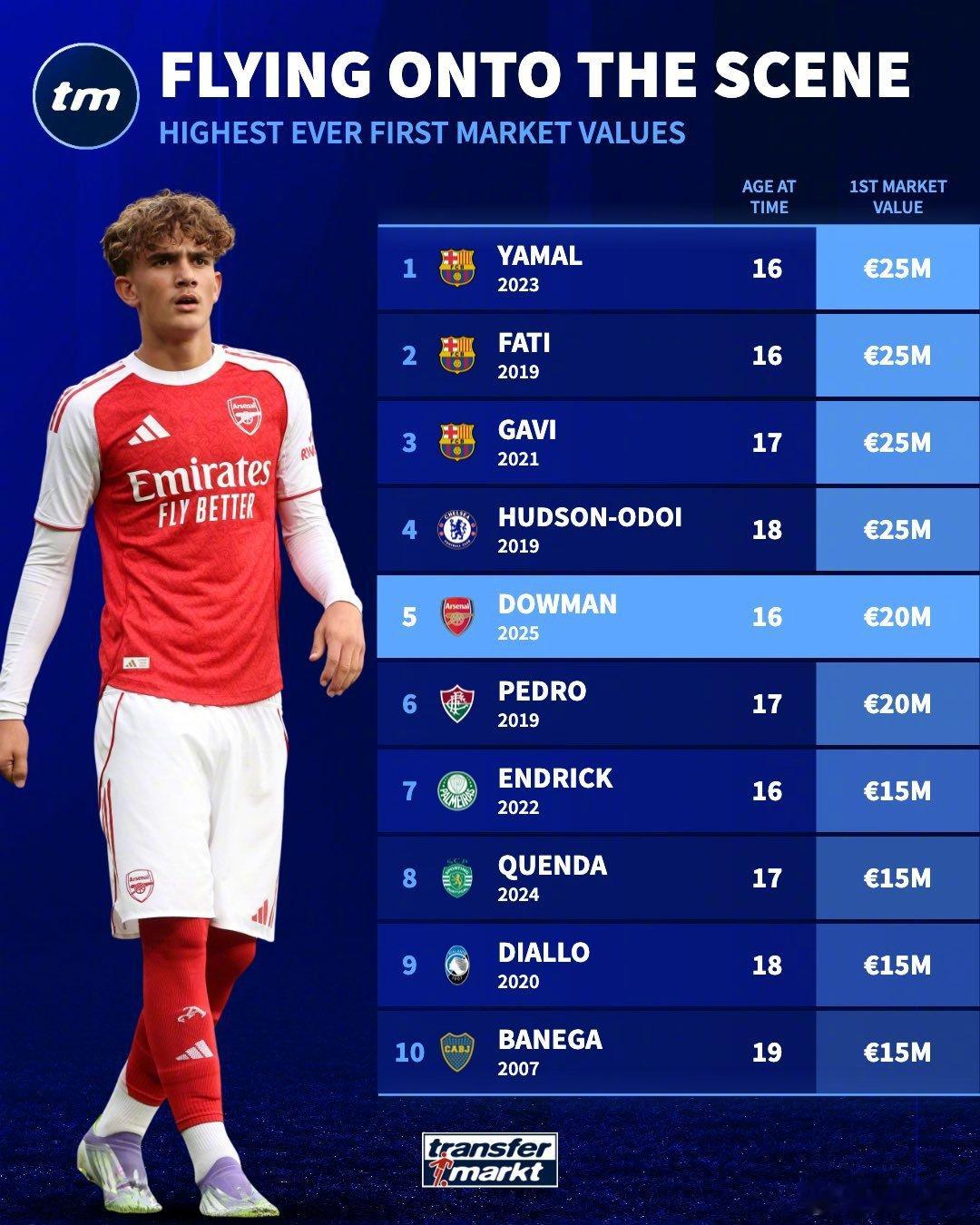 【生日球星】转会市场网:阿森纳小将道曼16岁生日迎来初始身价:20M欧元!这个初始身价能排名转会市场网的历史第5了!英超