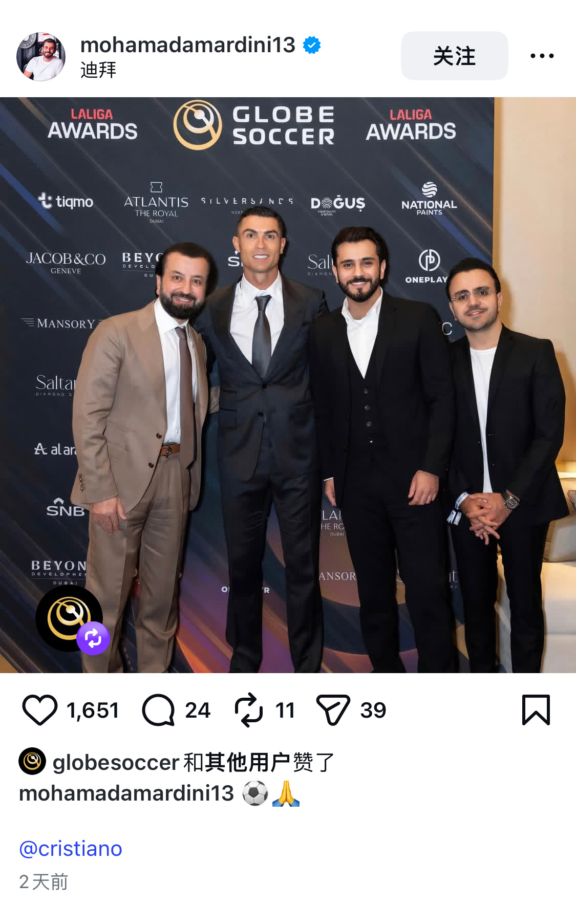 罗家父子都好适合穿西装啊啊C罗当选环足奖年度最佳中东球员