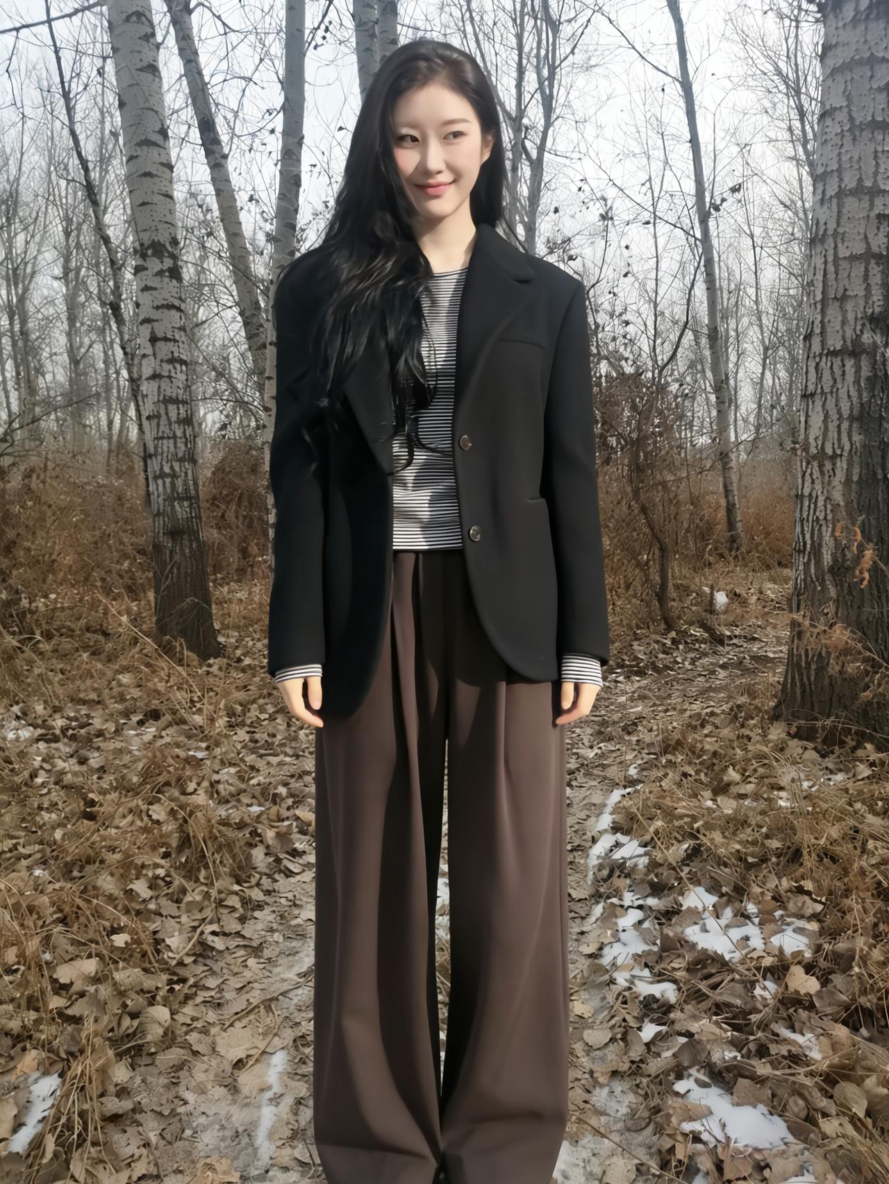 枯杨的枝干,是冬日的脊梁 她站在落叶间,是寒林的灵魂 黑西装的肩线,是挺拔的象征 棕裤垂落,是大地的沉稳 ~ 残雪在枯叶间,洇着细碎的白 她的笑,是撞进寒林里的光 不刻意的凌厉,是内心的坚韧 指尖轻垂的模样,像枝桠上悬着的冰棱 ~ 长发卷着,拂过西装的翻领 林间的风,都为她停下脚步 坚韧不是坚硬,是内心的丰盈 像一座山,沉默而坚定