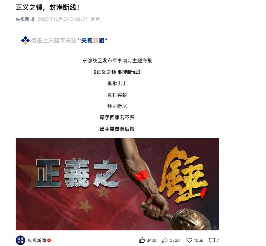 央视新闻年底12.30日早发布《正义之锤 封港断线》是想表明什么? 是否是要开始着手收复台湾的前宣,为2026收复工作提供前期定调宣传,还是说作为年终总结;求资深大佬解惑 ------------------------------------ 表明了上面想表明信号
