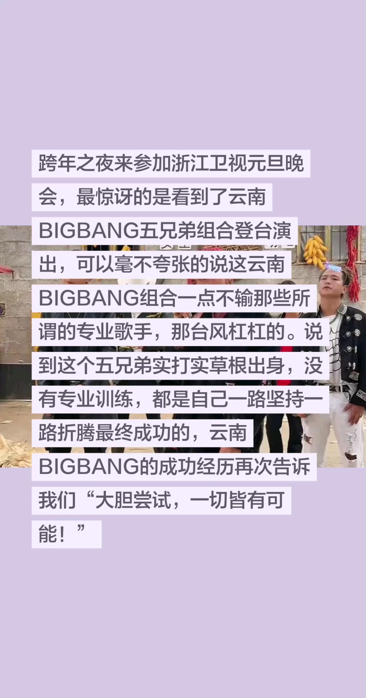跨年之夜来参加浙江卫视元旦晚会,最惊讶的是看到了云南BIGBANG五兄弟组合登台演出,可以毫不夸张的说这云南BIGBANG组合一点不输那些所谓的专业歌手,那台风杠杠的。说到这个五兄弟实打实草根出身,没有专业训练,都是自己一路坚持一路折腾最终成功的,云南BIGBANG的成功经历再次告诉我们“大胆尝试,一切皆有可能!”