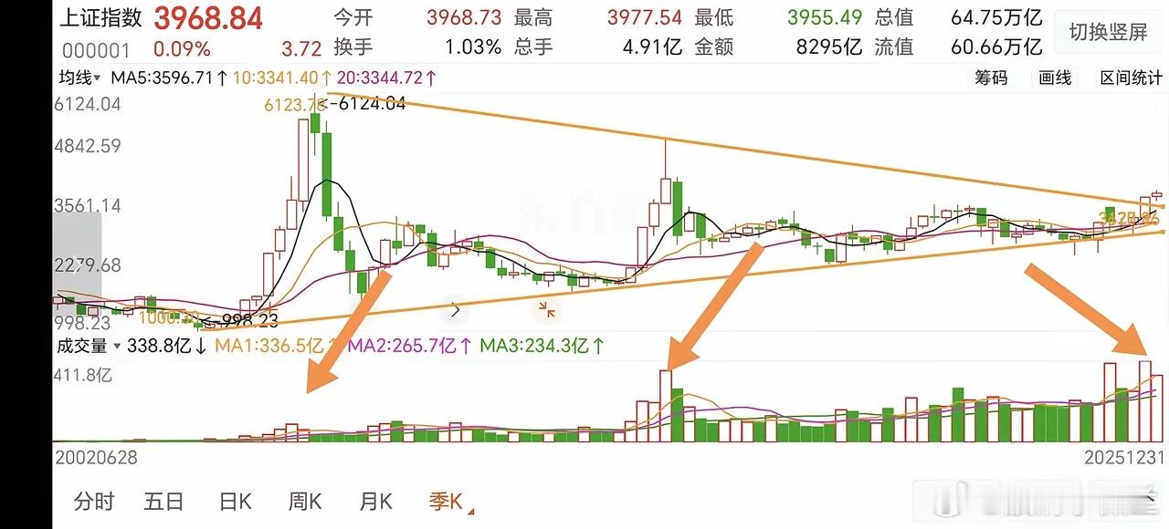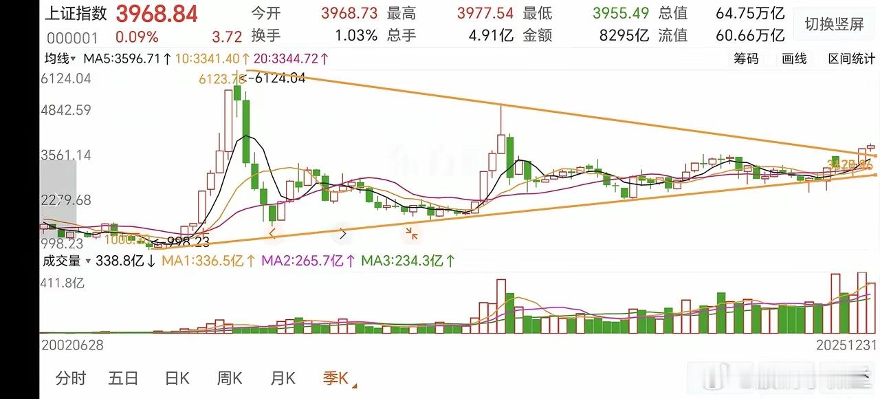展望2026,牛市值得期待!今年上证季线3连阳,仅次于2007年的季线9连阳和2015年的季线5连阳,明年大概率会延续季线连阳的节奏。从走势来看,上证已突破6124-5178点以来的下降趋势线,并在这里横盘4个月,接下来就等调整到位,蓄势待发,这里很大概率会迎来一轮主升浪行情。“天量对应天价”,“横有多长,竖有多高”。从2024年9.24开始,成交量能长期在1.5万上方,去年8月份至今,成交量甚至长期在2万亿上方,并有数次突破3万亿的历史天量。这么多资金涌进市场,必然提升牛市的热度和推高牛市的高度,而且市场经过10年长周期的盘整,整理已经非常充分,市场已足够成熟,有足够的条件和充分的理由,让我们对这轮牛市有高预期,高期待,指数没有理由不创历史新高。人生能有几回搏,此时不搏待何时?10年一遇的牛市,2026年有可能是最疯狂的阶段,拭目以待吧。