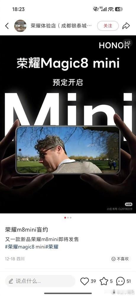 疑似有门店开始预热,荣耀Magic8 mini要来了! 据爆料,该机配备6.31英寸的1.5K LTPO直屏,搭载联发科天玑9500处理器,后置50Mp 1/1.5+长焦镜头,工程机电池额定容量5370mAh,典型值5500mAh±,采用金属中框,支持3D超声波指纹解锁。 另外,新机可能会提供白/黑/橙/紫4款配色,厚度5-6.xmm,主打超轻薄小直屏。 荣耀Magic8 mini