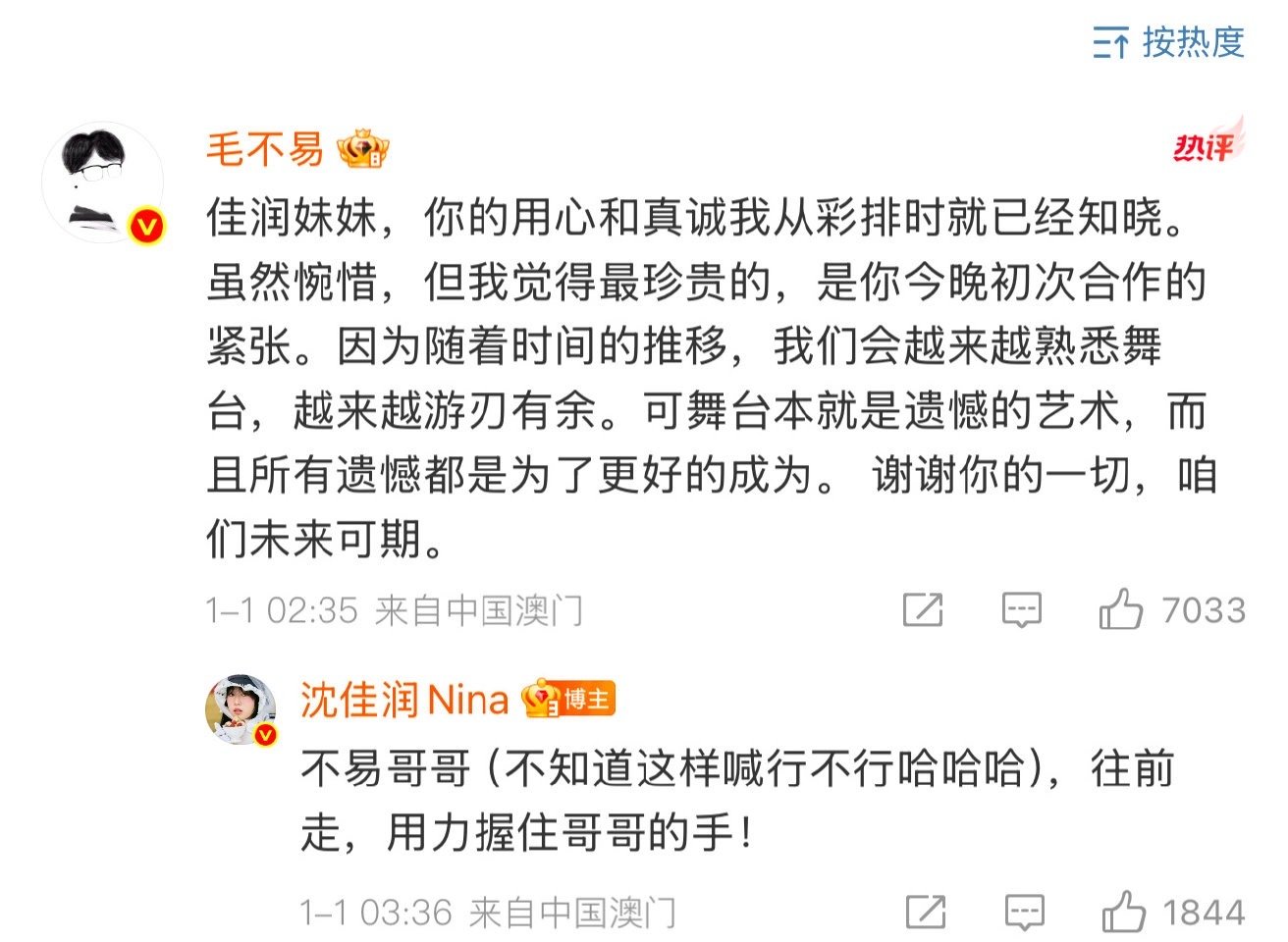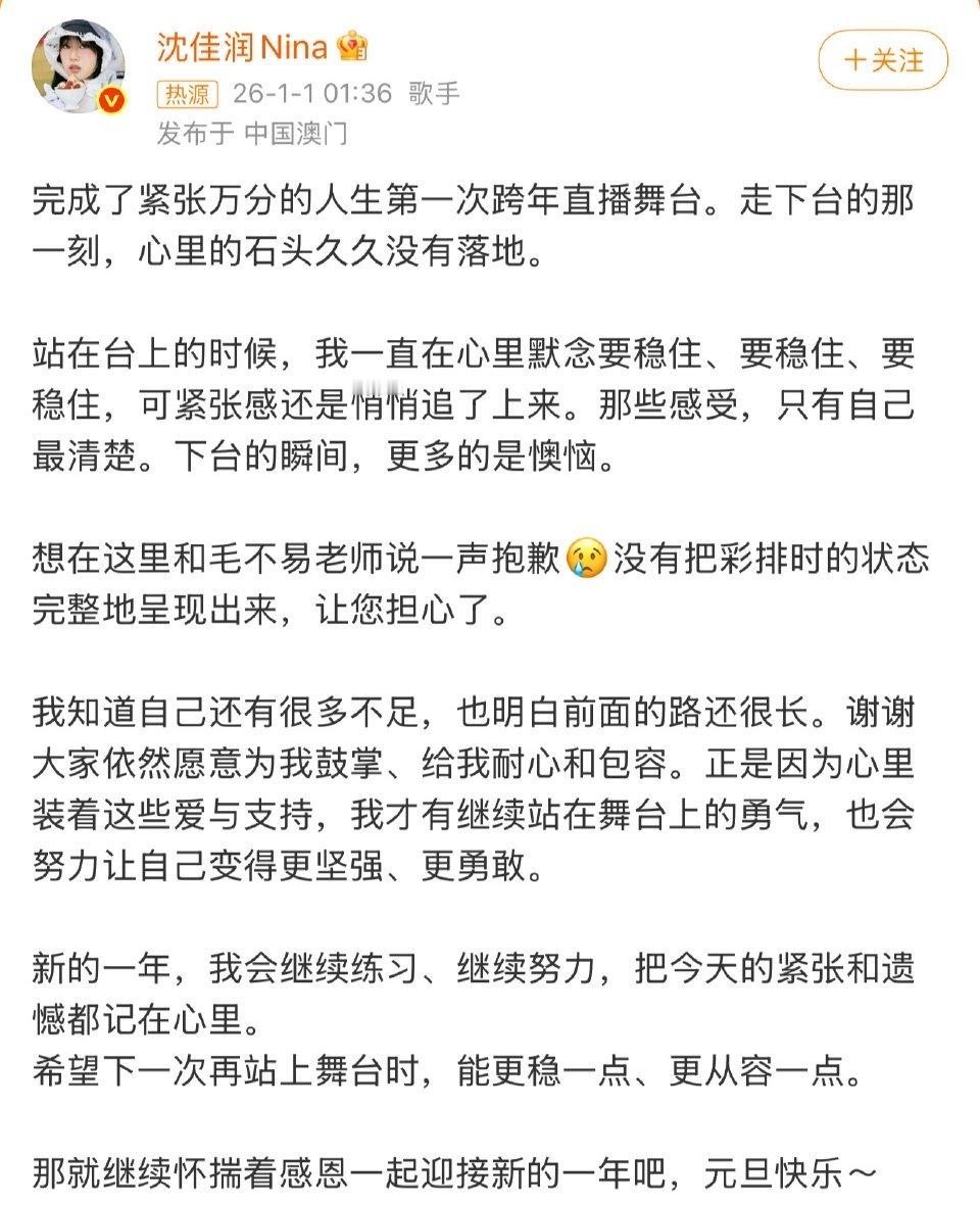 沈佳润回应跑调沈佳润发文向毛不易道歉 1月1日,沈佳润发文回应沈佳润跑调,并向毛不易道歉,“站在台上的时候,我一直在心里默念要稳住、要稳住、要稳住,可紧张感还是悄悄追了上来。那些感受,只有自己最清楚。下台的瞬间,更多的是懊恼。想在这里和毛不易老师说一声抱歉,没有把彩排时的状态完整地呈现出来,让您担心了。”随后毛不易暖心安慰“咱们未来可期”。