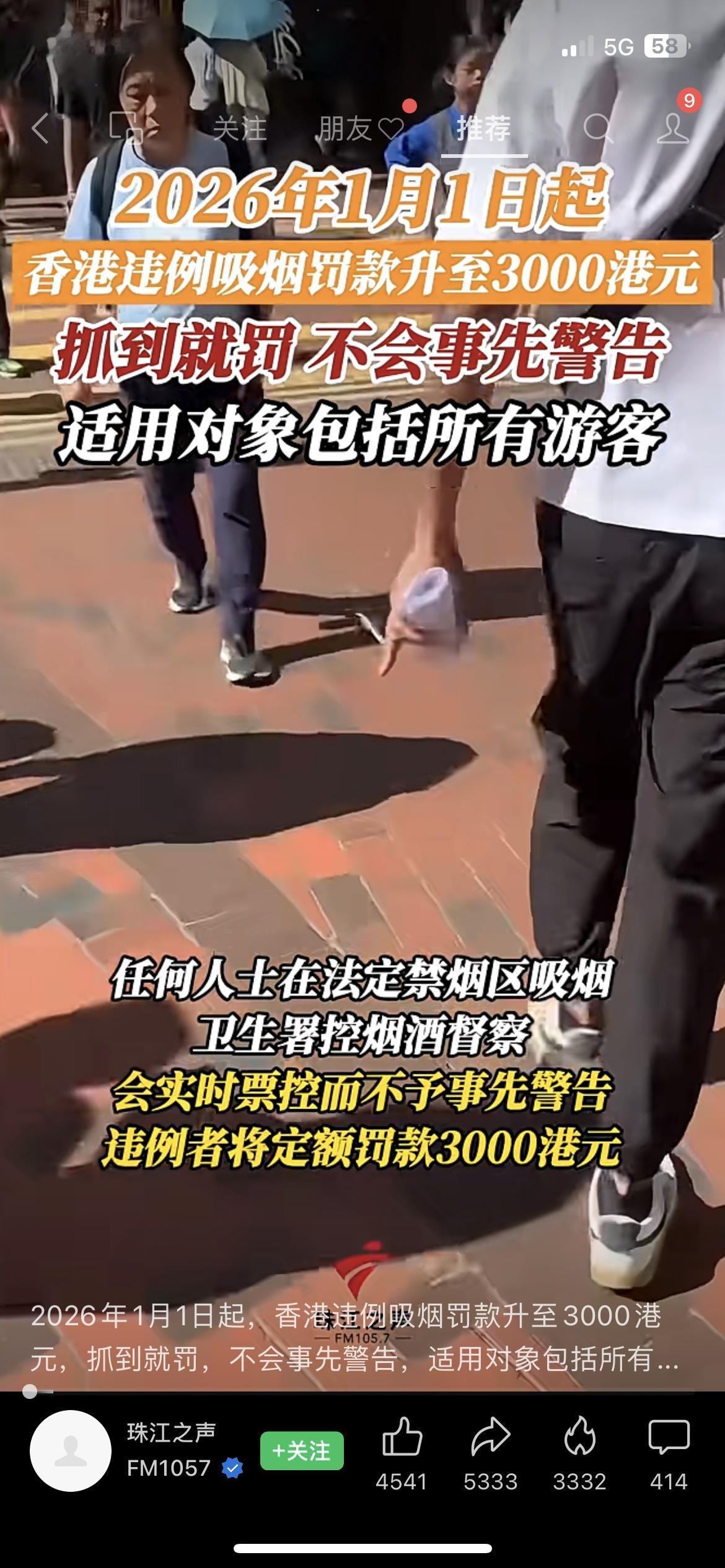 香港吸烟罚款涨至3000港元,游客也照罚 民生热点 刚刷到新闻,明年元旦去香港玩的烟民可得注意了,违例吸烟直接罚3000港元,还不提前警告! 据珠江之声报道,2026年1月1日起,香港违例吸烟罚款从1500港元翻倍到3000,不管是本地人还是游客,在禁烟区抽烟当场就开罚单。 同事老周元旦计划带家人去香港旅游,他是老烟民,看完新闻赶紧把打火机和烟都列入“慎带清单”,怕一不小心被罚。 你身边有没有爱抽烟的朋友打算去香港?觉得这个罚款新规能管住违例吸烟吗?香港酒店禁烟