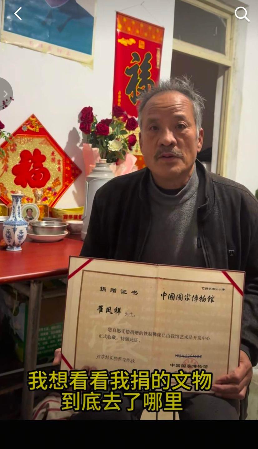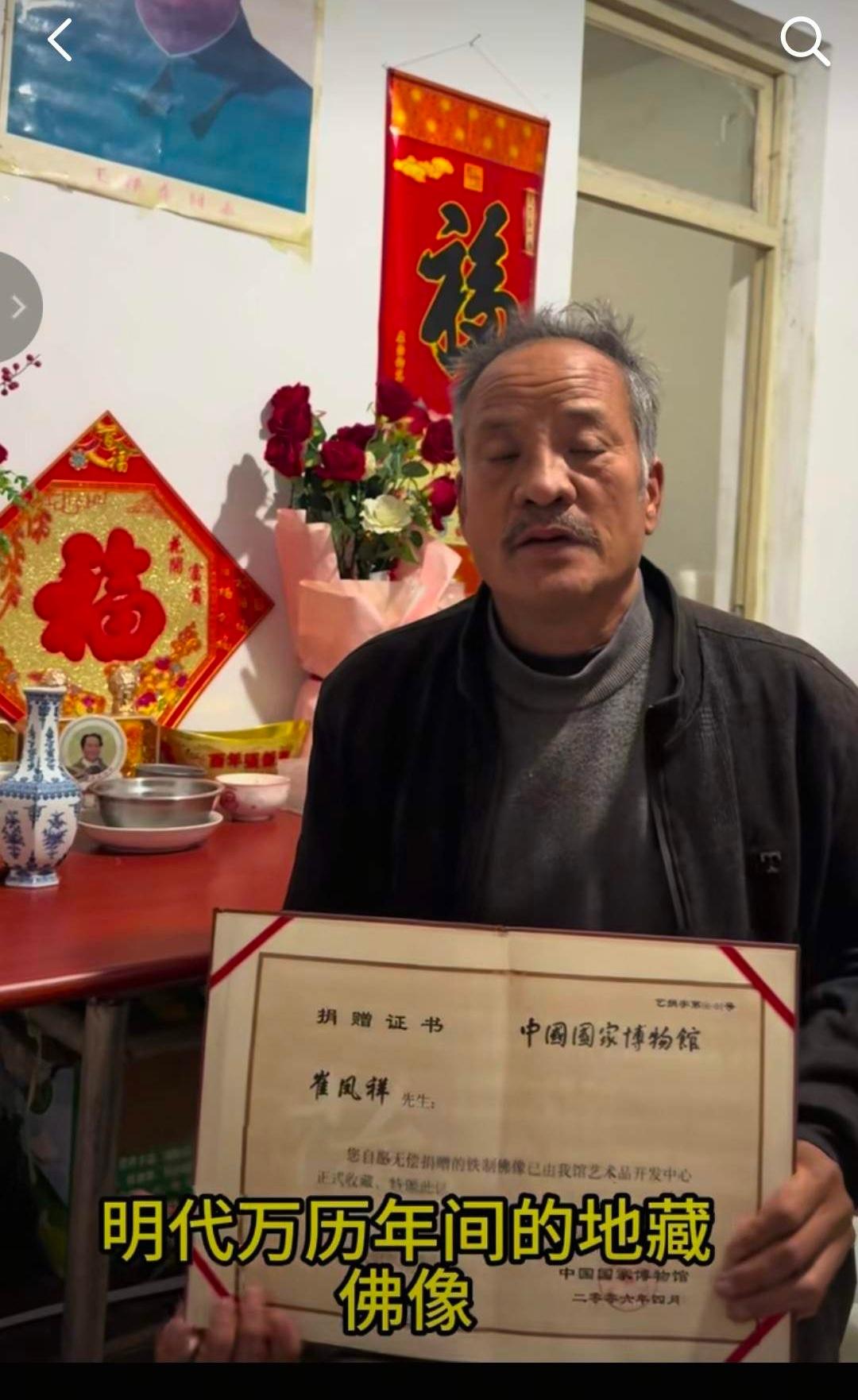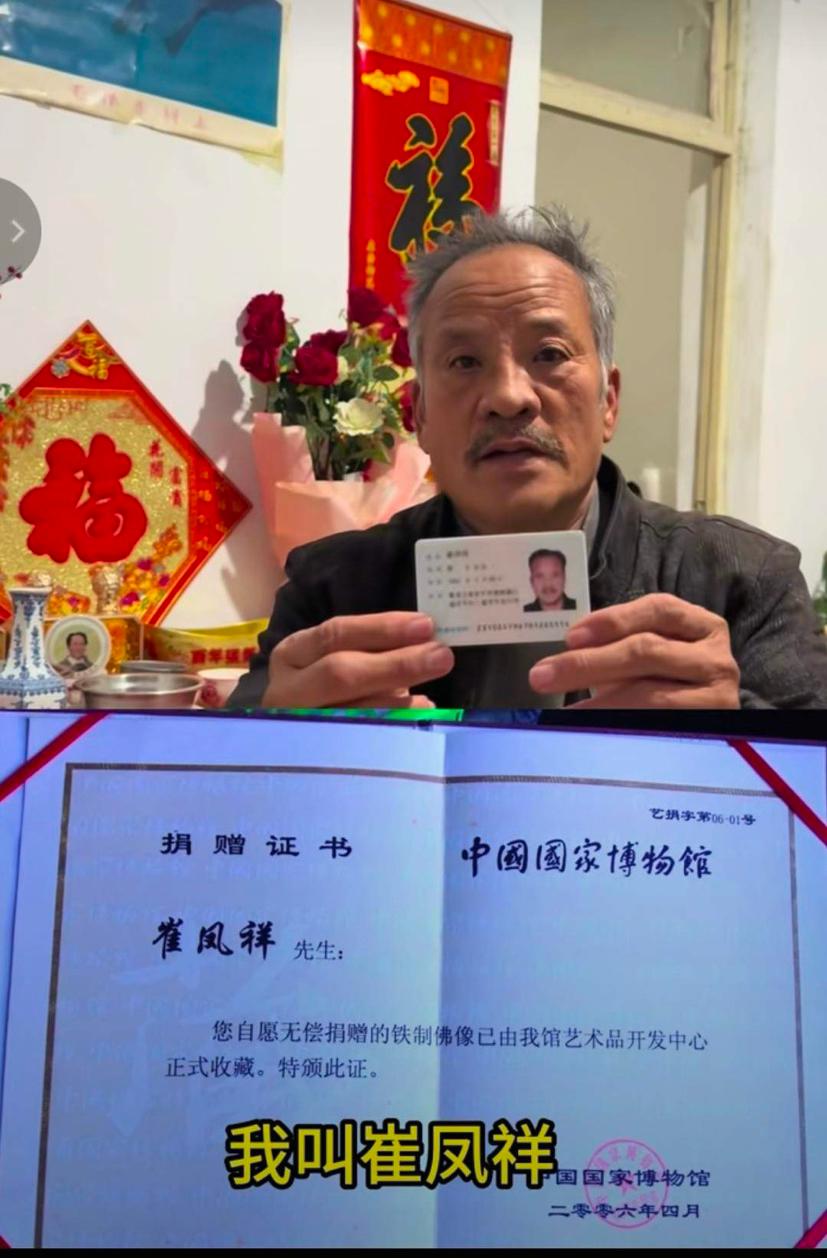 庞叔令还没完,又来一位老人手持身份证 ,向博物院追问捐赠物去向 庞叔令的事情让更多捐赠文物的人想看看之前捐赠的文物还在不在? 一位叫崔凤祥的老人说在2006年向国博捐赠了一件明代万历年间的地藏佛像,这尊佛像高78公分,重39斤 , 蓝色金花手头鎏金 ,腰细底下呈喇叭状 ,品相非常完好, 文物价值极高 。 老人联系了博物院表示愿意捐赠此文物,经办人侯松园等人,博物院给崔凤祥发了捐赠证书 。 捐赠几年后老人要去博物院看看捐赠的文物但被告知没有登记在册,博物院🈚️此文物。 此后老人多次向博物院反应此事,但没有结果。 博物院颁发了捐赠证书盖章难道不经过正规流程吗?捐赠证书发出去后文物回来没有人跟踪吗? 文物没有进博物院经办人肯定知道去向,博物院难道不管这事情吗?利用博物院的公章去欺骗捐赠者,博物院眼睛瞎了。 老人看到最近庞家捐赠文物的事后,借此机会网络举报,实属无奈之举! 老人家里放了很多伟人的相章,说明老人非常爱国,一心向党结果被某些人欺骗。 以后还有人会捐赠任何东西吗?