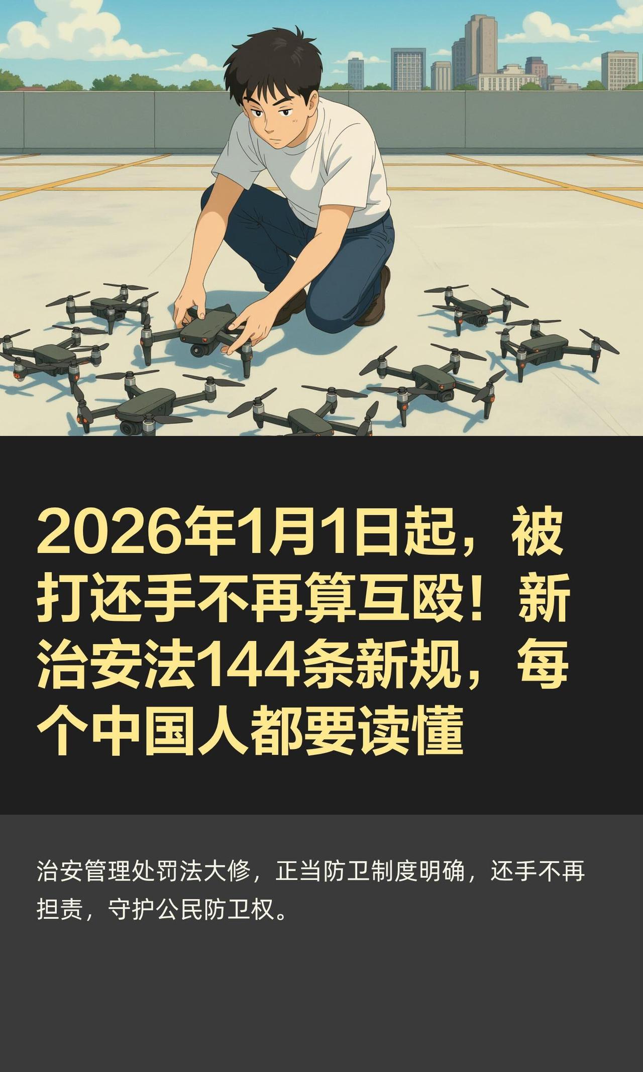 2026年元旦起,新的《治安管理处罚法》开始实行了。这次有个很重要的变化,就是第一次把“正当防卫”明确写进去了,规定如果你为了保护自己免受不法侵害而还手,不算违法。 说白了,就是以前那种“谁还手就算互殴”的局面被打破了。现在法律清楚说了:面对不法侵害,你有权反击,这不叫违法。 这次修法也是听了老百姓的声音,把一些大家关心的问题都明确了。比如现在常出现的无人机乱飞、高空抛物这些危险行为,也都写进了处罚范围。 总的来说,这次新规传递了一个明确的信号:法律不会向不法行为让步,公民保护自己的权利得到了更清楚的保障。以后遇到危险时,合理自卫的底气可以更足一些。