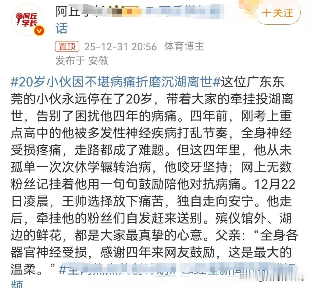 疾病太可怕了,这真是病来如山倒啊。近日东莞,20岁小伙因不堪病痛折磨沉湖离世。 他本来是想选择跳楼,但是因体力不支无法翻越围墙,最后选择了投湖结束了自己的生命。 最后的影像显示他拍了拍身上的白灰。 被网友称为对生活最后的温柔。 才20岁的生命,太可惜了。 人生真的是太不公平了。