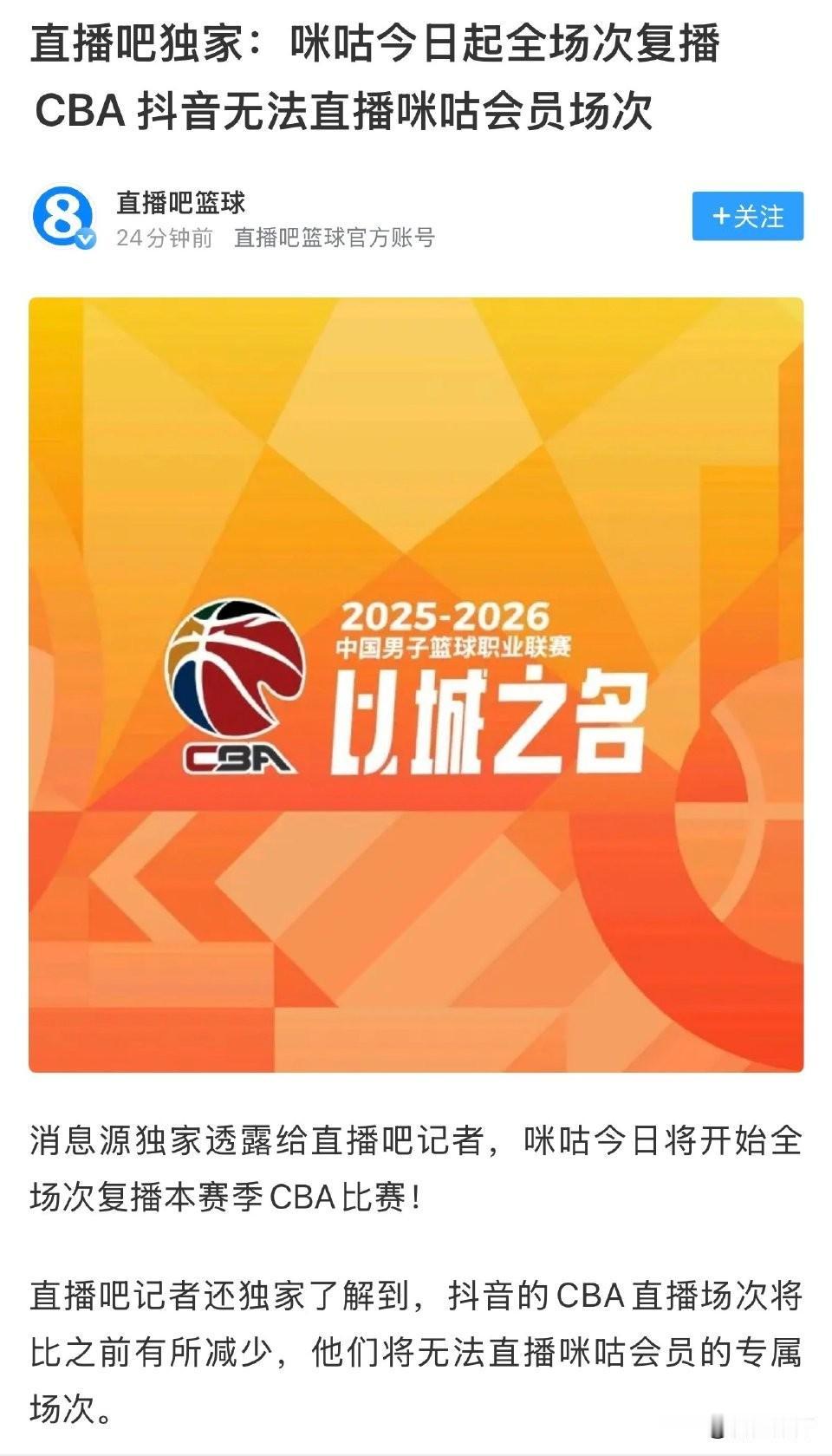 CBA迎来好消息!广大球迷朋友们,不用再辛苦看带货直播比赛了! 因为就在刚刚,CBA公司跟咪咕达成了合作,接下来将会在咪咕正式复播CBA的所有比赛。 这对于喜欢看专业解说的球迷朋友们来说,无疑是个好消息,虽然抖音直播也不错,但带货直播比赛的形式,在比赛观感上,终究还是差了点。 即便在CBA官号,抖音也贴心安排了无带货直播,可那上面解说的水平,我实在不敢恭维,有些解说员,不仅连球员名字都没记住,甚至连解说讲话,都是磕磕绊绊的,专业水平属实不过关。 这些对于已经直播了几年CBA的咪咕来说,就不会存在这个问题,咪咕不仅有专业的解说,还会请专业的解说嘉宾,在解说比赛的观感上,真的要好上不少!