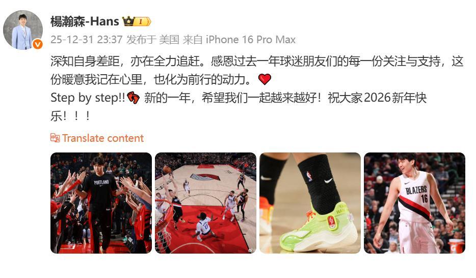 杨瀚森的新年祝福 发博送上新年祝福:“深知自身差距,亦在全力追赶。感恩过去一年球迷朋友们的每一份关注与支持,这份暖意我记在心里,也化为前行的动力。Step by step!!新的一年,希望我们一起越来越好!祝大家2026新年快乐!!! ”杨瀚森