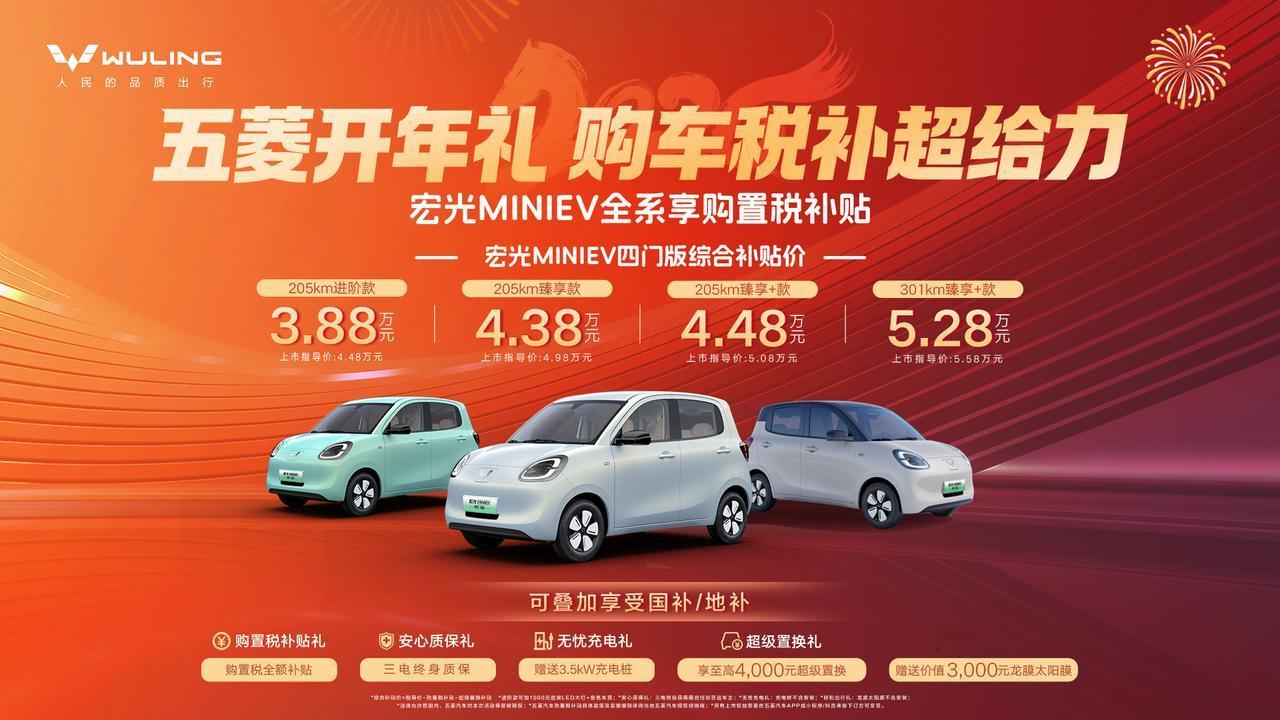 购置税政策有调整怎么办?宏光MINIEV为你出主意! 2026年刚开年,新能源汽车市场的购置税政策就有变化,这使得不少消费者举棋不定,开始观望。在这样的大背景下,上汽通用五菱出手了,先是缤果家族优惠齐齐上线,购置税全额补贴、至高5,000元置换补贴、赠送价值950元交强险、金融至高贴息2000元、赠送价值3000元3M太阳膜、赠送3.5kW充电桩等福利多多,又针对宏光MINIEV给到购置税全额补贴、至高4000元的无门槛超级置换补贴等政策支持,吸引了大量消费者的关注。 作为新能源代步车市场领导者,宏光MINIEV家族累计销量超190万辆,无论是市场表现还是口碑反响,都相当出彩。 宏光MINIEV家族能有如此出色的成绩,主要是其产品力给力。以宏光MINIEV四门版为例,既保留了小巧车身好开好停的优势,还在同级大部分车型采用双门布局的情况下,采用了四门四座布局,让后排乘客可以自由出入,方便又省心。而且宏光MINIEV四门版纯电续航最高达到301km,可以覆盖我们多样化的出行需求。 另外,宏光MINIEV超190万用户还共同构建了一个庞大的兴趣社群,车友会、改装聚会等活动层出不穷,车主们还自发地分享用车心得、创意改装与生活点滴,从而形成了宏光MINIEV车友圈和文化圈,宏光MINIEV也成为一张独特的社交名片,可以承载车主们的情绪价值。 可以说,趁着这个窗口调整期,入手缤果家族和宏光MINIEV都正是时候!
