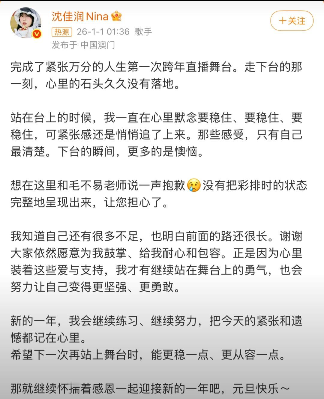 不染真的唱到崩溃 谁懂沈佳润唱《不染》的窒息感!全程跑调明显,疑似还改了调,不染本身就是地狱难度曲目,妹妹肉眼可见的紧张到心态崩盘,下台立马发文向毛不易诚恳道歉,直言太紧张没发挥好~ 毛不易也太温柔了!当场牵手暖心鼓励,评论区回复更戳人,全程无半句责怪,满是包容体谅。 妹妹年纪小遇大场面紧张太真实,真唱敢开口就赢了,比起假唱摆烂,这份真诚太难得! 网心疼妹妹也心疼毛不易,真唱不易,且行且珍惜啊!
