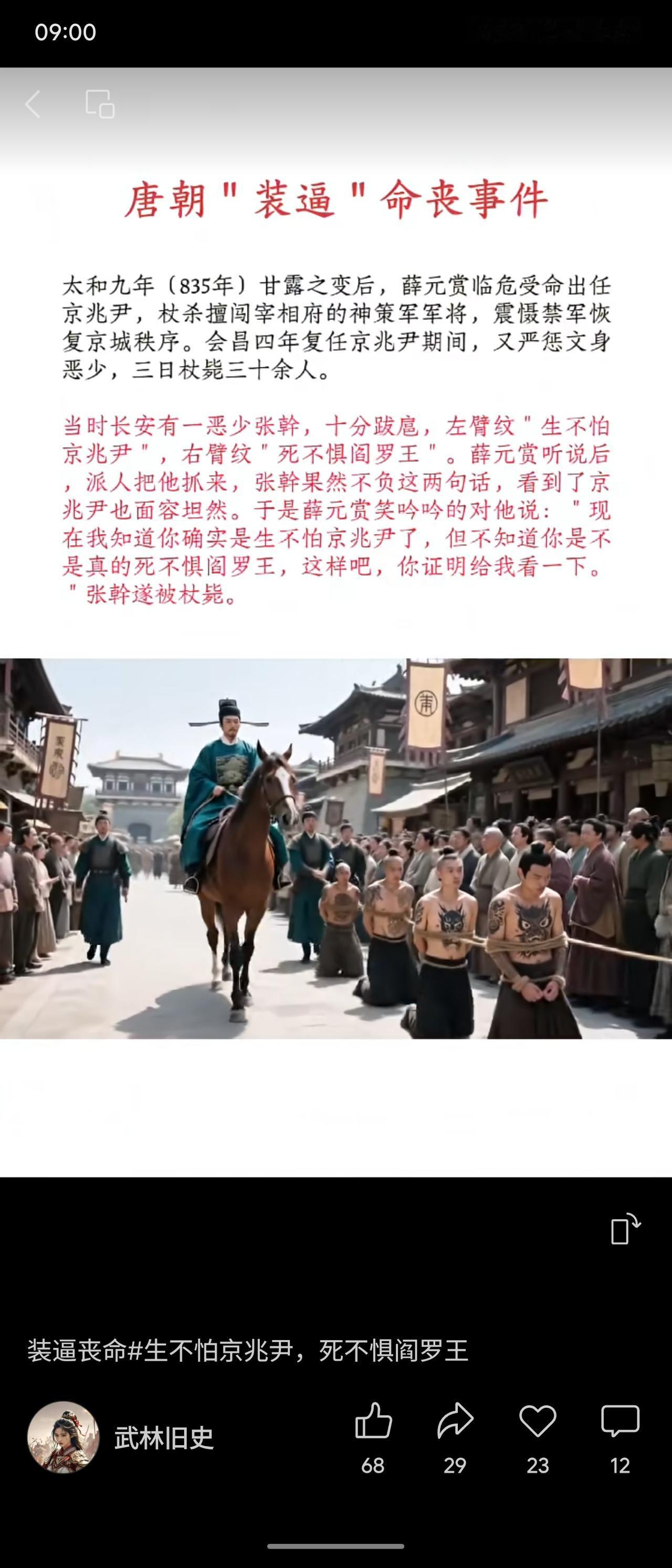唐朝京兆尹薛元赏严治长安,恶少张幹双臂刺字“生不怕京兆尹,死不惧阎罗王”公然挑衅。薛闻讯将其抓捕,反讽道:“既纹此字,便证明你是否真不怕阎罗王。”遂命人将其杖毙。张幹终因嚣张跋扈丧命。