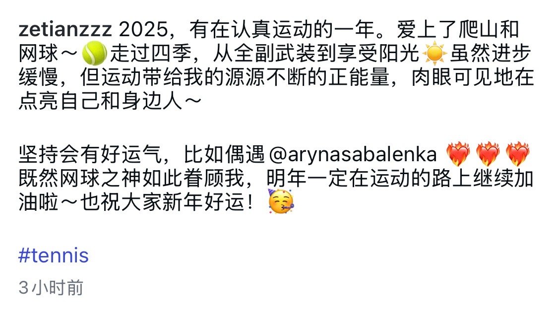 章泽天回顾自己的2025年,她说这是认真运动的一年,爱上了网球和爬山。