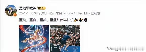 吴敬平老爷子更新微博了。简单十二字“至纯,至真,至善,至坚!新年快乐!”配图是马到成功和樊振东在德甲比赛的图片。2026年元旦伊始,看到他再次发文还是跟樊振东有关。 吴敬平在樊振东全运会后发微博烤红薯,随后说被大家过度解读不好,停更一段时间。