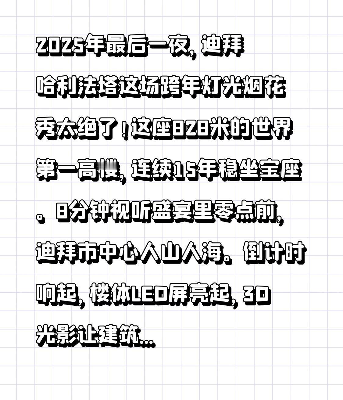 2025年最后一夜,迪拜哈利法塔这场跨年灯光烟花秀太绝了!这座828米的世界第一高楼,连续15年稳坐宝座。8分钟视听盛宴里 零点前,迪拜市中心人山人海。倒计时响起,楼体LED屏亮起,3D光影让建筑“活”了,流星滑落、彩虹攀升,现场欢呼声不断。上千架无人机组成流动光影,与地面15000枚烟花呼应。金色烟花绽放,搭配音乐喷泉,灯光、烟花、水声、音乐交织。它还以中、阿、英三国语言送上“新年快乐”迪拜观景照