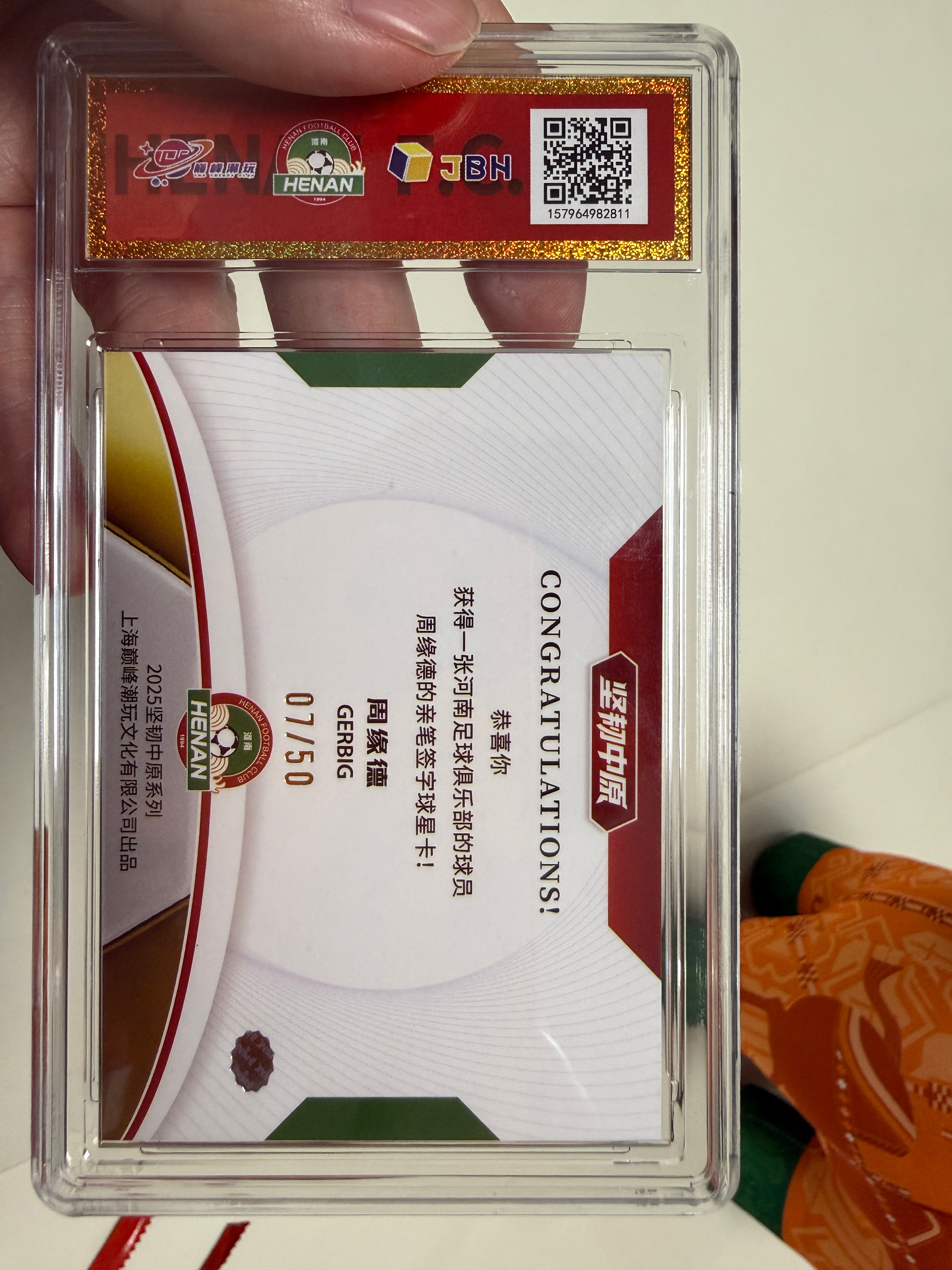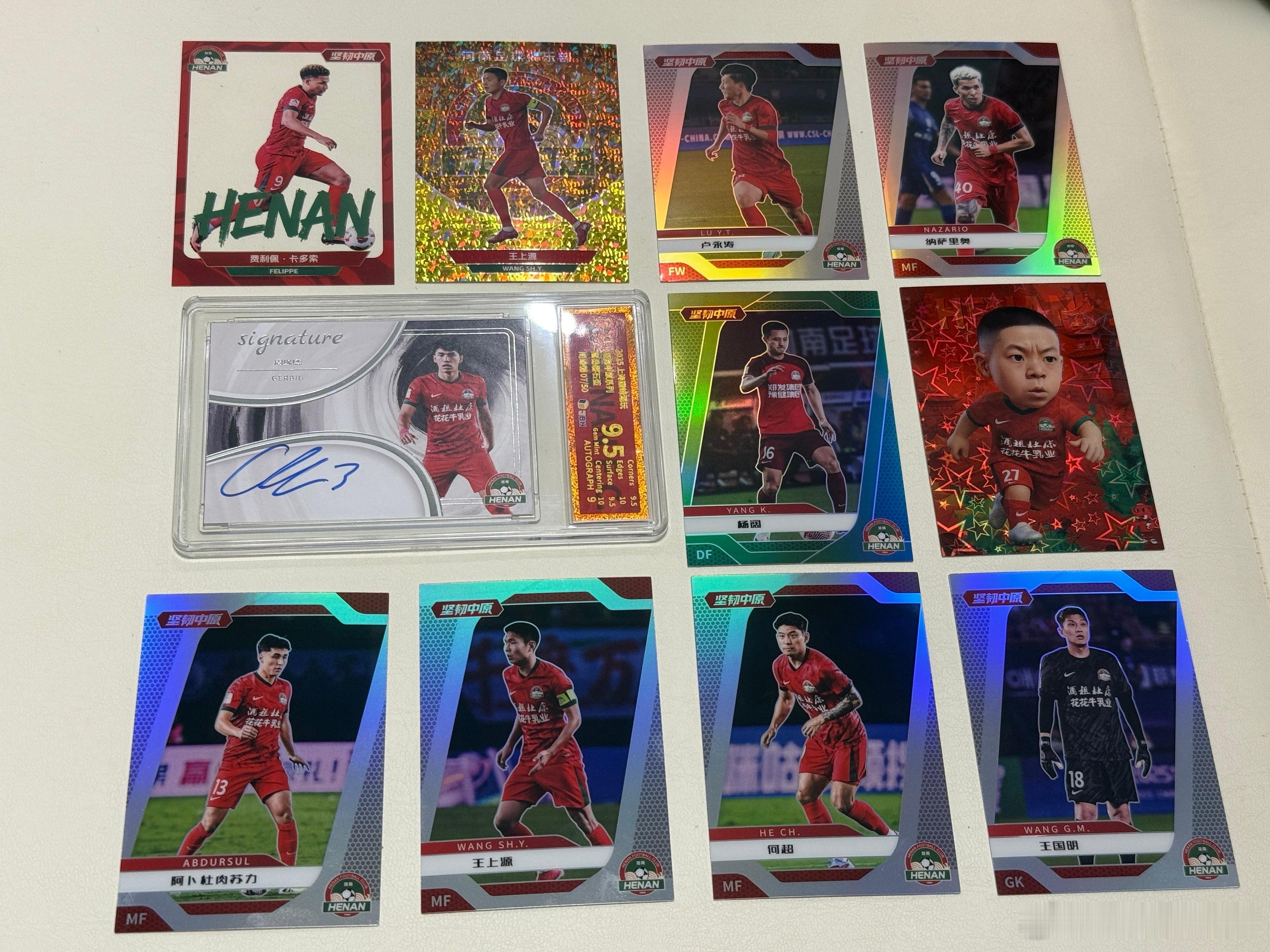 河南队 预售 298 元/盒的河南俱乐部官方球星卡,保底一张亲签。这款周边如何?新年第一天开一盒河南队俱乐部推出的官方球星卡,base 卡里开到金色的王上源 10/10 带编卡,保底的亲签是 7/50 的周缘德。作为河南球迷和队记,必须支持一下。也是第一次开河南的球星卡。河南足球俱乐部