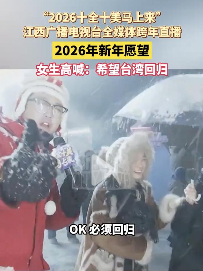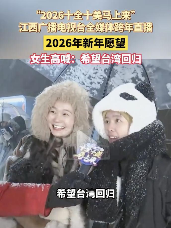 这下出名了,不仅江西人民知道了,全国人都知道了! 1月1日,江西庐山,电视台主持人在采访中问两位正在登山的女生:“新年的第一天,你们有什么新年愿望吗?”一位女生笑着回答:“希望明年暴富!”说完哈哈的大笑起来,主持人也笑了,附和跟着说暴富、暴富。 主持人接着又把话筒递给另一个女生,这位女生对着话筒大声说到:“希望台湾回归!”这句话一出口,三个人都大笑起来,主持人更是竖起大拇指说:“ok,必须回归!” 随后主持人扬起手说:“这把庐山拉到了更高的高度!”是啊,“台湾回归”是每一个中华儿女的共同心愿,我们都在心底期待着,期待着台湾回归的那一刻! 有网友说,你把全国人民的心愿都说了! 有网友说,众望所归,希望台湾早日回家! 2026,新年快乐!大家都有哪些新年愿望呀?欢迎留言分享