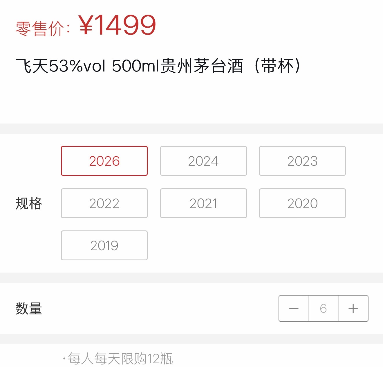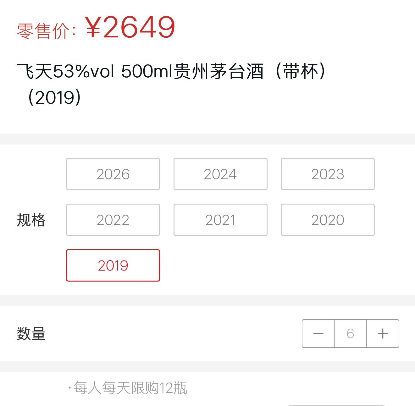 i茅台每人每日最多可购12瓶可以平价买到茅台真不错,虽然也得抢,好消息是可以选年份!