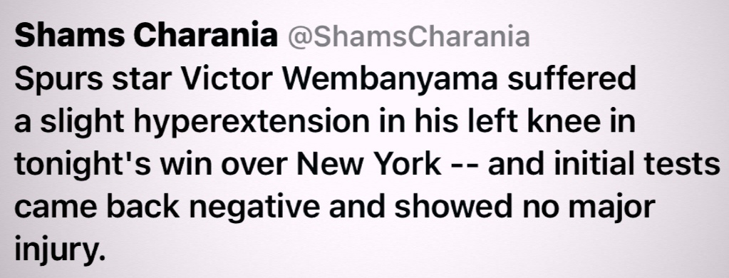 Shams:文班亚马左膝轻微过度伸展, 初步检查没有大碍 。尼克斯vs马刺