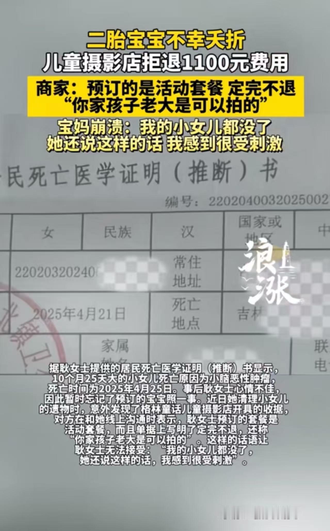 吉林,二胎宝宝不幸夭折,母亲想要退掉之前购买的摄影套餐,却遭到了商家的无情拒绝,1100元的费用愣是一分都不肯退。商家还冷漠地表示:“你二女儿没了,可以留着给你家老大拍!”宝妈崩溃哭诉:“我的小女儿都没了,她还说这样的话,我感到很受刺激!” 12月30日,来自吉林省吉林市的耿女士在社交平台上倾诉了自己的遭遇。2024年6月,她迎来了二胎女儿的诞生。在当地一家月子中心坐月子时,一家名为“格林童话”的儿童摄影店上门免费为宝宝拍摄了月子照。 在店家的游说下,她额外购买了一套价值1100元的百天照加周岁照套册,满心期待着记录下女儿成长的每一个美好瞬间。 然而,命运却对她开了一个残酷的玩笑。数月后,小女儿被诊断出患有小脑肿瘤,尽管家人竭尽全力,可还是没能留住这个小小的生命。 2025年4月25日,年仅10个月25天的小女儿永远地离开了这个世界。 失去女儿的痛苦让耿女士沉浸在悲伤之中,暂时忘记了预订的宝宝照一事。 近日,当她清理小女儿的遗物时,意外发现了收据,于是联系店家,想要退掉这份再也无法兑现的套餐,却没想到遭到了店家的拒绝。 店家给出的理由是:“咱们这个订单是可以给一家孩子拍的。因为你月科当时拍完了,定的这套餐而且是活动套餐。单据上也是写着不退的。你家孩子老大是可以拍的。” 可耿女士根本无法接受这样的说法。当初月子照商家说是免费拍摄的,这额外花费1100元购买的百天照加周岁照套册,本就是专门为小女儿准备的。 而且,在小女儿满一百天后,她跟店家约时间拍照,对方却以孩子抬头不好看为由,让她晚些再约。又过了两个月,当她再次预约时,又被告知店面正在装修,拍照时间一拖再拖。如今小女儿没了,店家却轻飘飘地让她带着老大去拍,这无疑是在她的伤口上撒盐。 耿女士觉得,如果带着老大去拍,每看到那些照片,就会想起失去老二的痛苦,这会让她的生活更加煎熬。于是,她将这件事发到了网上,瞬间引发了网友们的热议。 有网友说,这种极小概率的事店家真的是太冷漠了,1100对于当事人不至于太穷,对于店家也不会破产,但当事人孩子没了,于情于理都应该退。 也有网友说,商业契约,拒绝道德绑架!你还是可以带着二胎宝宝去拍的,影楼没规定只能拍活着的,即便是提前去天国的宝宝,带着她的遗物或者遗像去拍一套以做纪念,也是可以的。 还有网友说,这情况我遇到过,有个客户来买台空调,说她奶奶要在医院回家,想要给她装台空调。结果空调装好后,过了两天客户打来电话说原本师傅来装就推迟,客户问能不能退了,说老人走了空调就没必要装,我听到后说没问题,但来回送货费要减50,客户直接来句减200,当是红包,她说原本只是想看看能不能退,不能退就算了,有些钱真不能赚,原本家人去世已经够伤心了。 从商业契约的角度来看,商家或许有自己不退款的所谓“理由”,毕竟单据上写着不退。但从人情世故和道德层面来讲,商家的做法实在是让人心寒。 孩子夭折,对于任何一个家庭来说都是沉重的打击,商家在这个时候不仅没有给予一丝安慰和理解,反而为了那1100元钱,说出如此冷漠无情的话,实在是缺乏基本的人文关怀。 做生意,讲究的不只是利益,更是口碑和人心。像这样只看重眼前利益,不顾及消费者感受的商家,或许能在一时赚到一些小钱,但终究是做不长久的。 毕竟,在这个充满竞争的市场环境中,只有真正用心对待顾客,才能赢得顾客的信任和支持,生意才能红红火火、长长久久。 来源:极目新闻