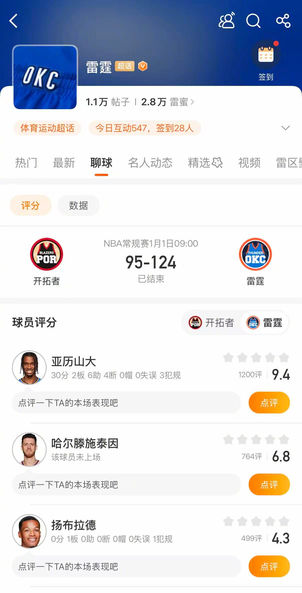 雷霆战胜开拓者 雷霆124-95战胜开拓者。亚历山大30分2篮板6助攻,杰威13分7篮板7助攻,切特12分。开拓者方面,杨瀚森今天获得了上场机会,登场10分50秒,得到3分5篮板,西索科19分,阿夫迪亚17分。欢迎大家进入球队超话俄克拉荷马雷霆 和波特兰开拓者 对球员表现进行评分!杨瀚森3分5篮板