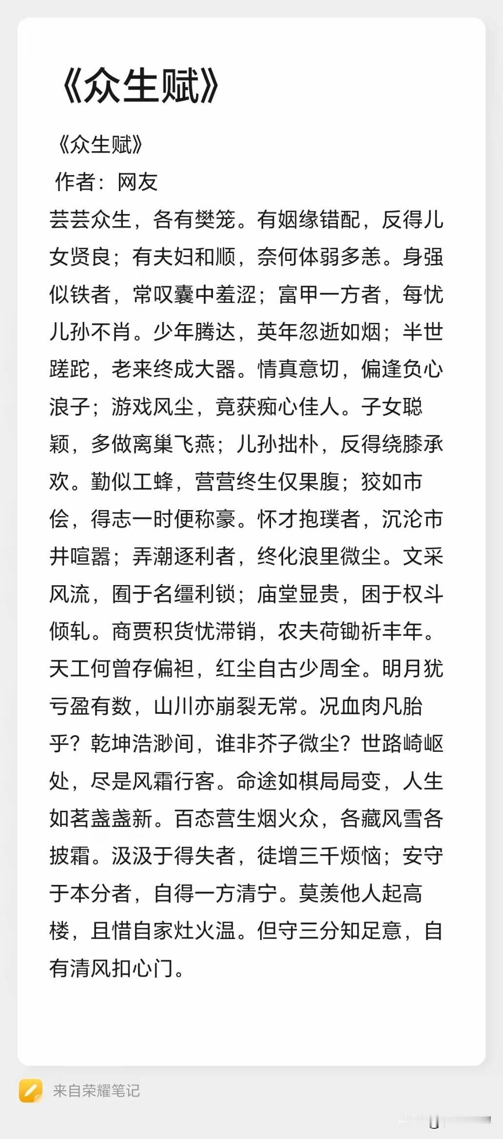 今天在头条看到一篇很悲观的文章,意思是表达:告诉底层人不要结婚生子,也不愿自己的后代来世当牛做马。 在当下社会里,不少人总被这样的悲观情绪左右着,遇挫时便困在“不如意”的执念里走不出来。其实不妨停下来读读这篇《众生赋》,这篇文字道尽了世间真相:姻缘错配或得贤子女,夫妇和顺却可能体弱多恙,身强体壮者常缺钱,富甲一方者有时儿孙败家不争气,世间从无绝对的圆满。 明月尚有盈亏,山川亦有崩裂,血肉凡胎的我们,本就逃不过命运的棋局变幻。世人皆如芥子微尘,奔波于尘世,有人勤苦一生仅够果腹,有人巧取一时却终归微尘,汲汲于得失,只会徒增三千烦恼。 人活一世,不求事事圆满,贵在守住内心的满足。也要知道,穷不过三代,富也富不过三代,不必羡慕他人高楼万丈,珍惜自家灶火的温暖就好;只要内心存三分知足,清风自会扣响心门,这便是生活最好的模样。