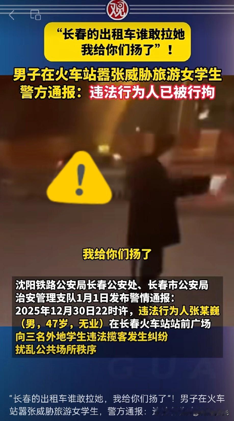 长春的出租车,谁敢拉她,我给你们扬了! “谁敢拉你,我就砸谁的车!” 听听这口气,不知道的还以为是哪路“地头蛇”在清场。 结果呢?就是个长春火车站趴活的黄牛。 欺负人家刚下火车的女学生,30块打表的车费张嘴就要70,帮忙提个行李说天下没有免费的午餐,还要买烟当辛苦费,不给就撒泼耍横,甚至当街报号威胁。 这就不仅是贪婪了,这是赤裸裸的坏。 好在这次踢到了铁板,当事女生妈妈态度强硬:紧盯结果,绝不私了。 人现在已经被带走了,这结局极度舒适。 这种人之所以这么狂,无非是平时在这一亩三分地横惯了,觉得外地人好欺负,没人敢管。 一颗老鼠屎,坏了一锅汤。 如果不把这股歪风邪气彻底刹住,这所谓的热情好客,以后谁还敢信? 奉劝外地来的旅客,下火车后那种揽活的不要搭理他们,去坐正规的出租车或者网约车就行。这样也更安全,门口揽活的那些黄牛不知道“蛮横”多少年了! 长春打出租车