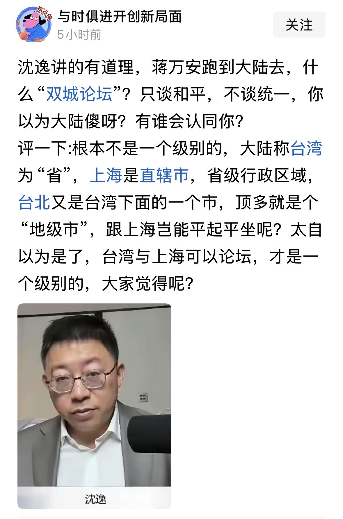 沈逸指责蒋万安只谈和平,不谈统一,这就是复旦大学国际政治教授的水平,还不如网友看的明白……