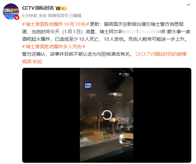 据英国天空新闻台援引瑞士警方消息报道,当地时间今天(1月1日)凌晨,瑞士阿尔卑斯山区滑雪小镇克朗-蒙大拿一家酒吧起火爆炸,已造成至少10人死亡、10人受伤。死伤人数有可能进一步上升。