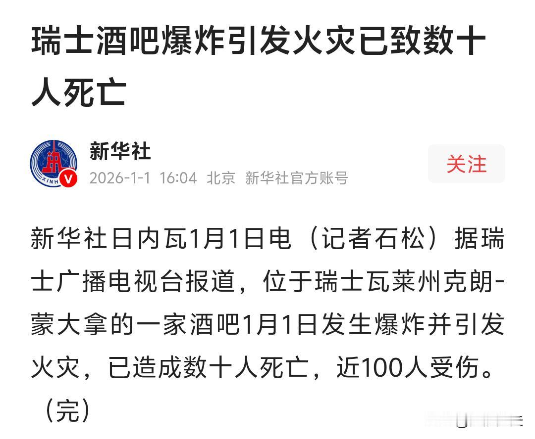 综合瑞士广播电视台、英国天空新闻台及多家中文媒体2026年1月1日的同步报道,当天凌晨,瑞士瓦莱州滑雪小镇克朗-蒙大拿一家名为“星座”的酒吧在举行跨年活动时发生爆炸并引发火灾。目前官方通报的伤亡数字为:至少10人死亡、10人受伤,死伤人数可能进一步上升。 新华社援引瑞士广播电视台的表述为“数十人死亡,近100人受伤”。 瑞士警方已封锁事发区域并在上空设立禁飞区,初步排除恐怖袭击可能,爆炸原因仍在调查中,不排除与新年燃放烟花或存放不当有关。
