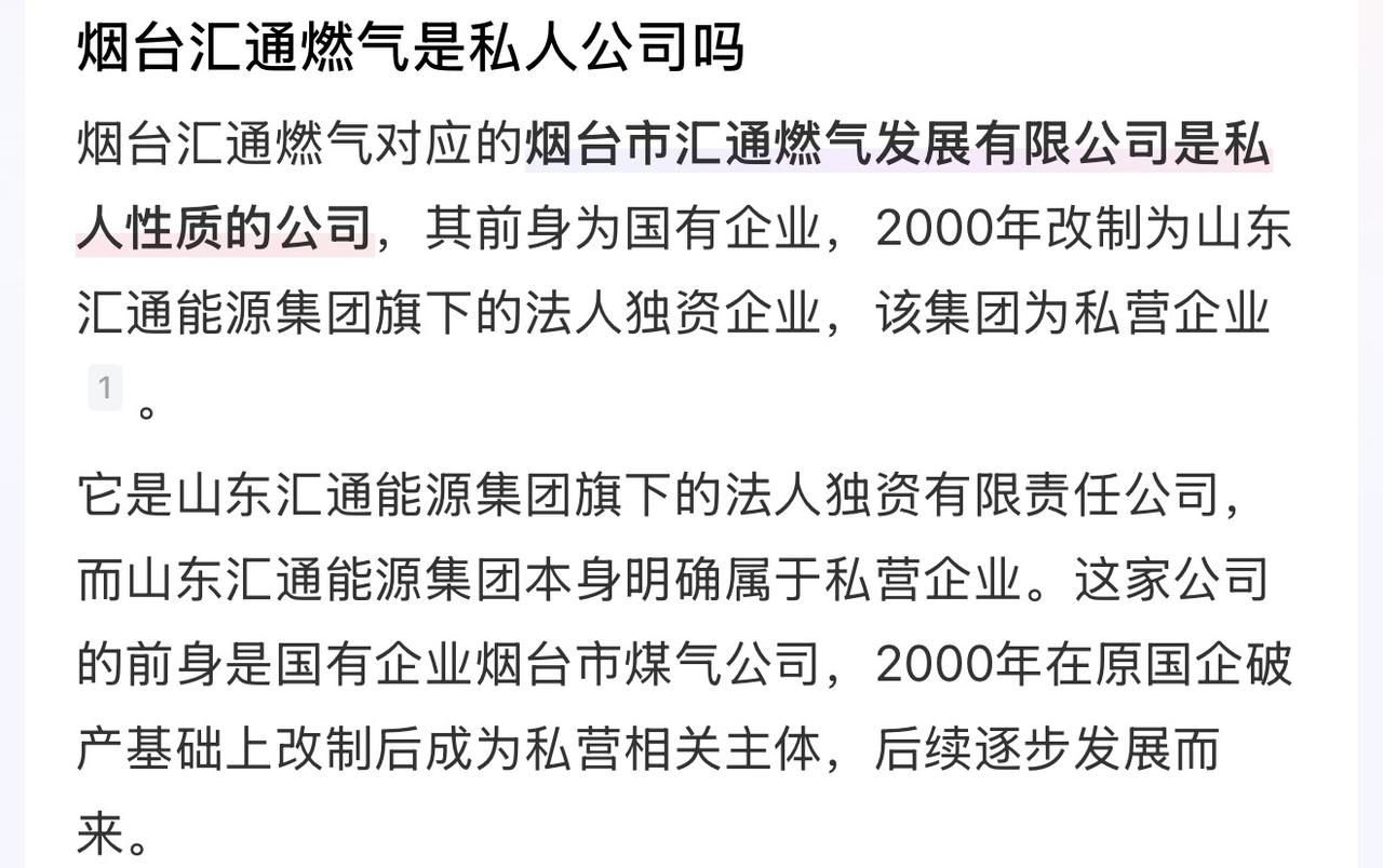 烟台汇通燃气价格160元1罐,蓬莱区其他企业有90多元一罐,很显然汇通燃气不仅是垄断问题,也是对广大市区市民下手够狠。 在网上搜了一下,汇通燃气前身是国企,2000年改制成私企,这就很奇怪,像燃气类产品都是很赚钱的,国有资本为何不继续控股,为何突然变成个人的了呢? 所以我想我们不仅仅要让烟台液化气价格回到一个合理的区间,也应该对于国企、集体企业变成私人企业的所谓改制进行倒查,就从2000年开始倒查,不符合规定的改制应该一律给予纠正,属于国家和集体资产的一律收归国家和集体。