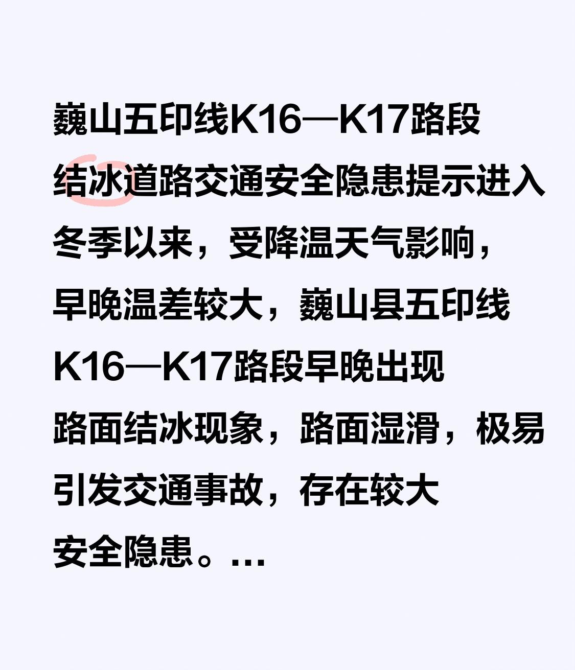 巍山五印线K16—K17路段结冰道路交通安全隐患提示 进入冬季以来,受降温天气影响,早晚温差较大,巍山县五印线K16—K17路段早晚出现路面结冰现象,路面湿滑,极易引发交通事故,存在较大安全隐患。为保障广大群众出行安全,巍山县公安局交通管理大队提示:请广大交通参与者提前规划出行时段,尽量错开早晚道路易结冰时段出行;行经该路段时,务必谨慎驾驶,减速慢行,保持安全车距。特此提示 巍山县公安局交通管理大队 2026年1月1日