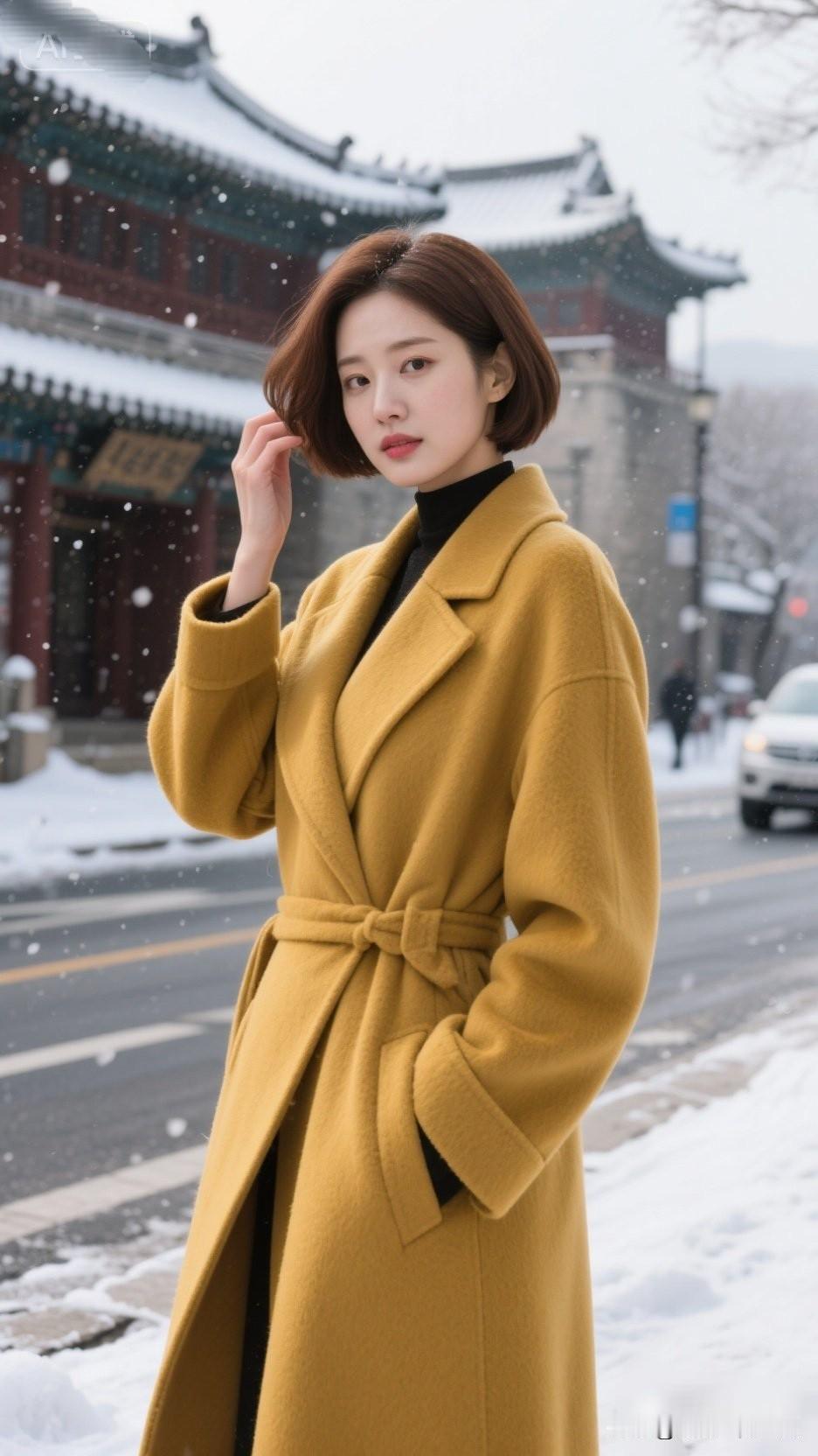 风里美人立,雪里黄衣飘。冬日暖阳下,黄衣少女漫步雪中,唯美如画。