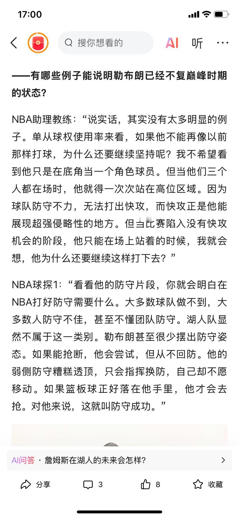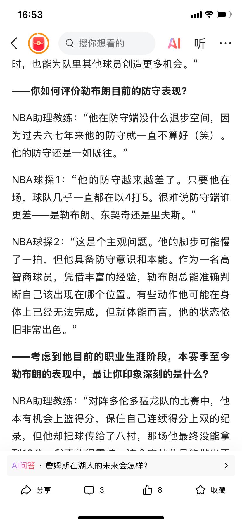 詹蜜们自己看吧!NBA教练、球探如何评价詹姆斯防守。 我场场发他快下让队友4防5的GIF图,你们说我不配、是故意黑。现在呢?教练球探们总有资格了吧? 如果所有老将都像他那样为数据而打球,哪个球队会要…… 全力15分钟和划水35分钟,谁对球队帮助打还用比较吗?