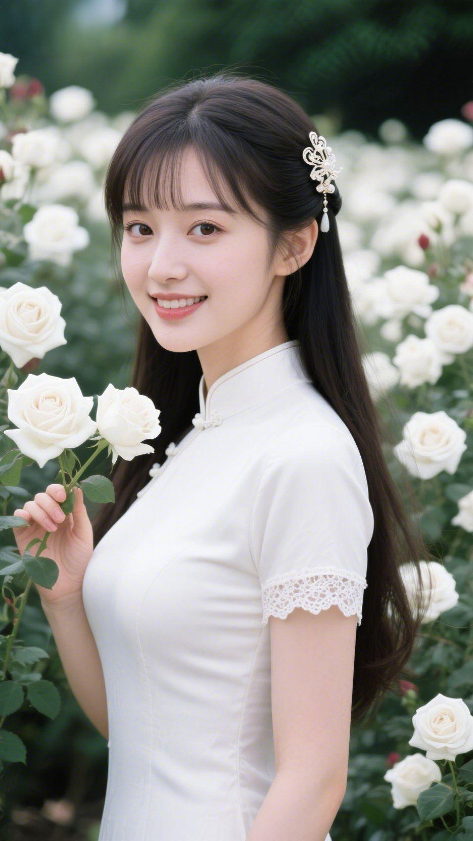 素旗袍裹白玫温 白玫香缠过发梢,她身上的素色旗袍似浸了晨露的软——蕾丝袖缀着轻雅,发间蝶饰沾着柔光,衬得花簇的白愈发明润。 指尖蜷着花枝的暖,笑涡裹着清芬,立在花影里时,像把中式温婉织进衣料褶皱。 恰似瓷瓶旁斜倚的素绢,无冗杂色泽,只有妥帖的柔——日常雅意裹入每寸衣料,抬眼的明,都浸着这抹素白的温。 素旗袍日常穿搭 白玫柔雅感