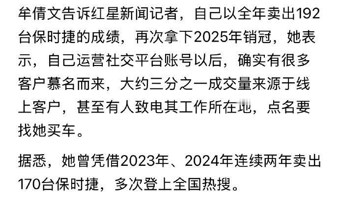 保时捷女销冠真的厉害,连续三年冠军,出名后,网上很多人点名找她买车,看来也是很多粉丝了