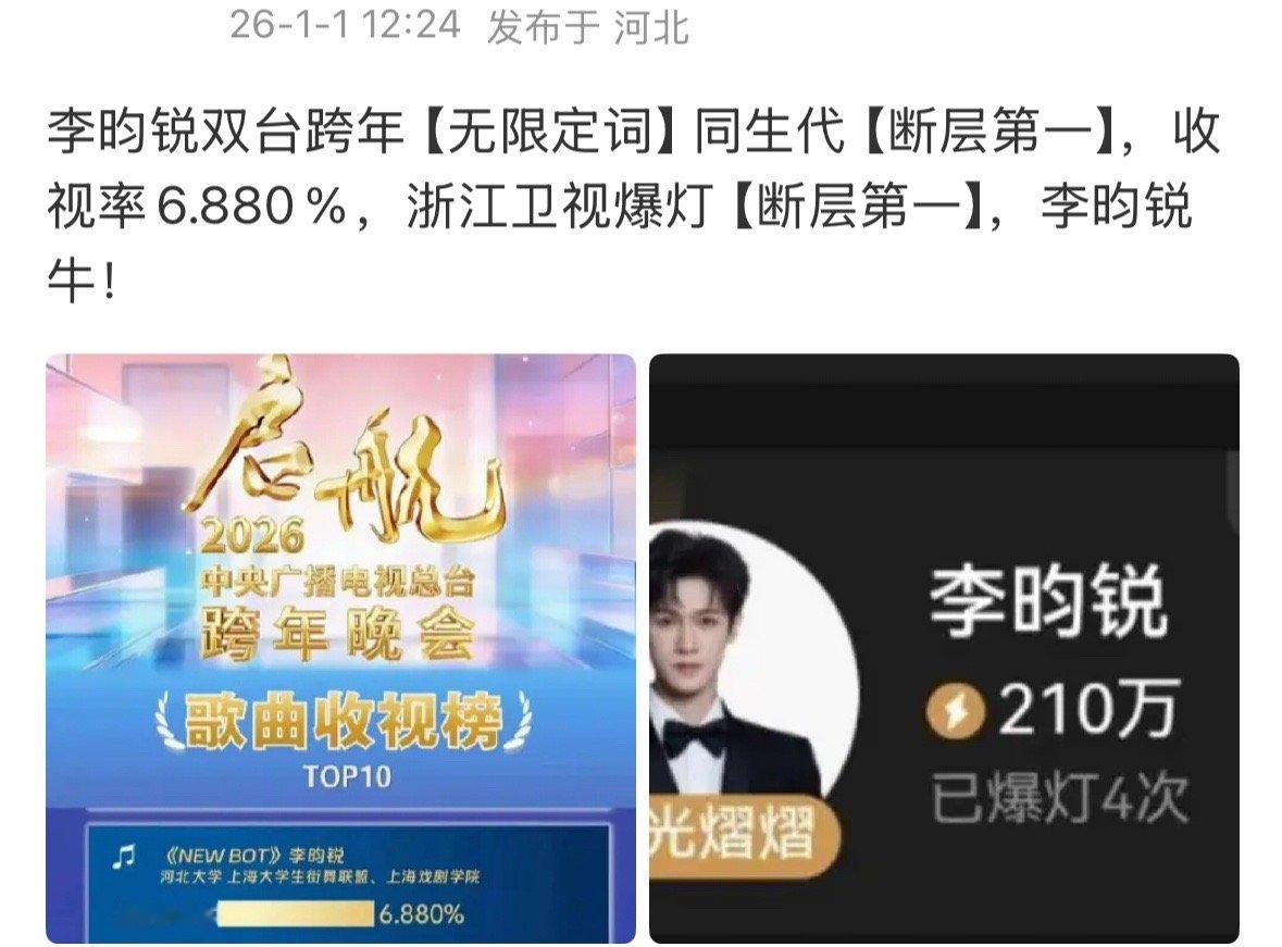 李昀锐双平台跨年收视率95生第一,浙江卫视爆灯第一!☝🏻