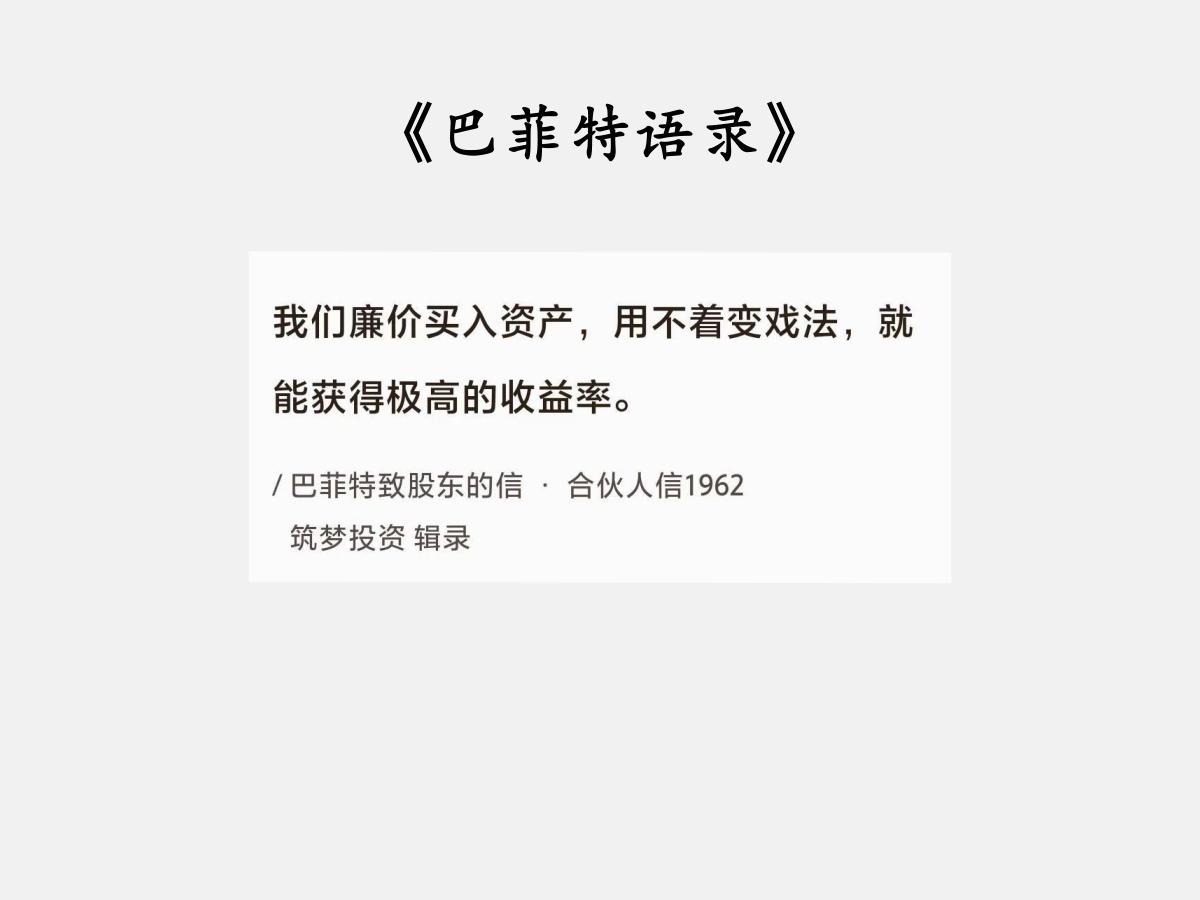 No.049 巴菲特谈“廉价买资产” 巴菲特曰:“我们廉价买入资产,用不着变戏法,就能获得极高的收益率。” 每股价值百元的股权,30元买入的那一刻,就有了两倍多的潜在收益。即使在40元买进,也能有一倍多的潜在利润。并且,还什么都不用干,耐心等着就行。 在生活中,我们买东西都希望做到“物美价廉”。股市投资也一样,希望能够“用严重低估的打折价买到优质公司的股权”。 然而,与生活不同的是,股市更容易做到“物美价廉”。 在生活中买东西,基本上都是一分价钱一分货,甚至很多时候是三分价钱一分货。像奢侈品,更是不知道多少价钱一分货了。 股市不一样。当行情悲观,熊途漫漫时,即使是优质甚至伟大的公司,也可能打骨折价出售。把金子卖出白菜价,在股市里是很司空见惯的事儿。 股市就像个淘气鬼。它可不管公司是优质还是垃圾,是低估还是高估,该跌时都照样跌,该涨时也都能涨。谁也拿它没办法。