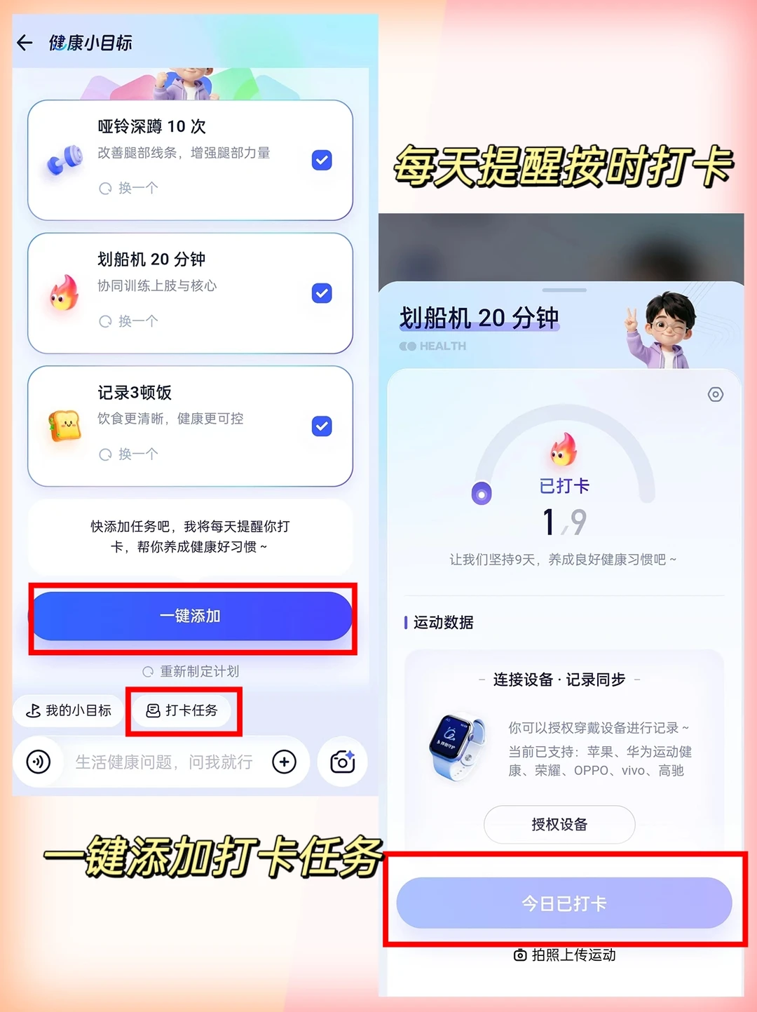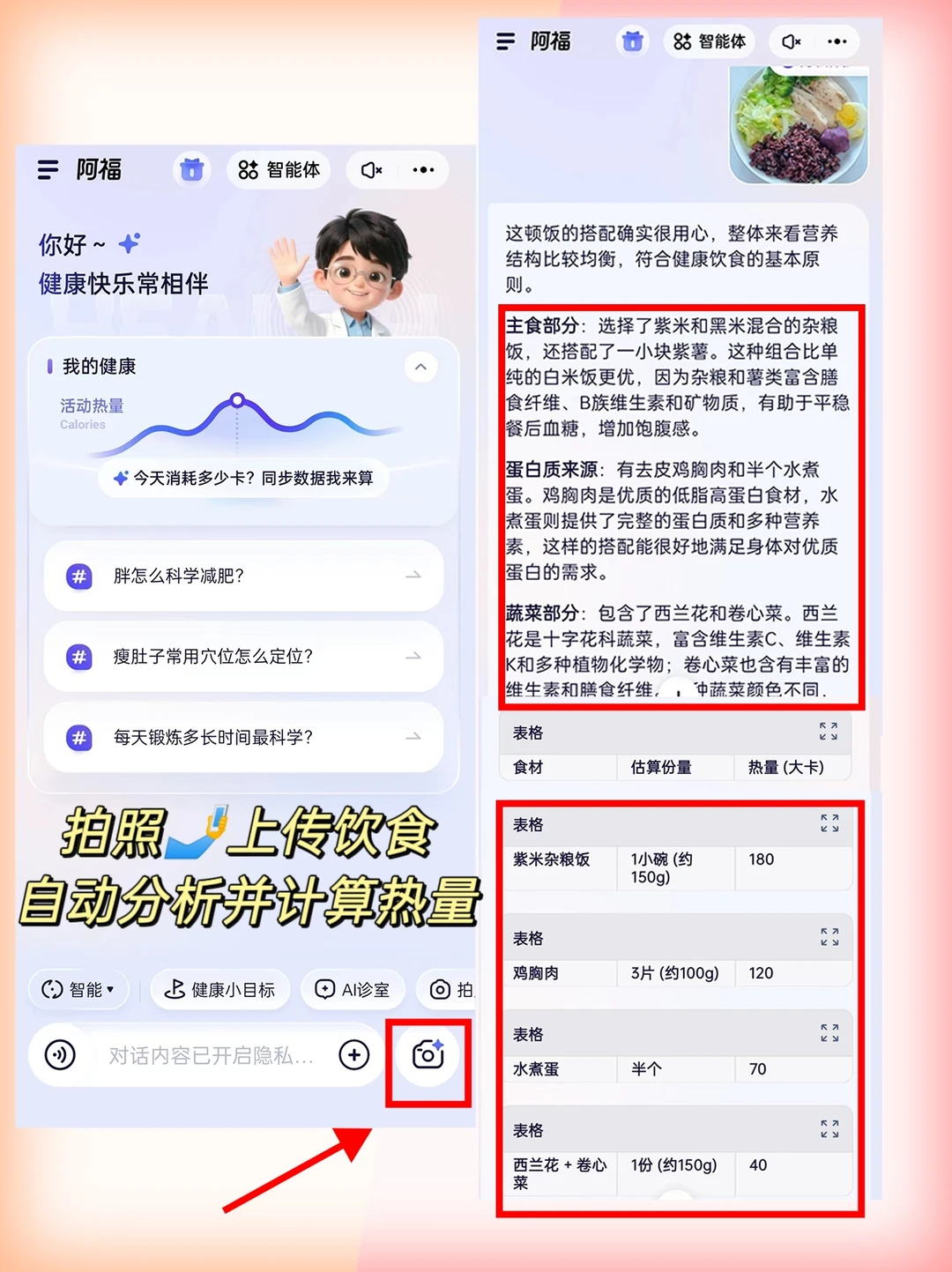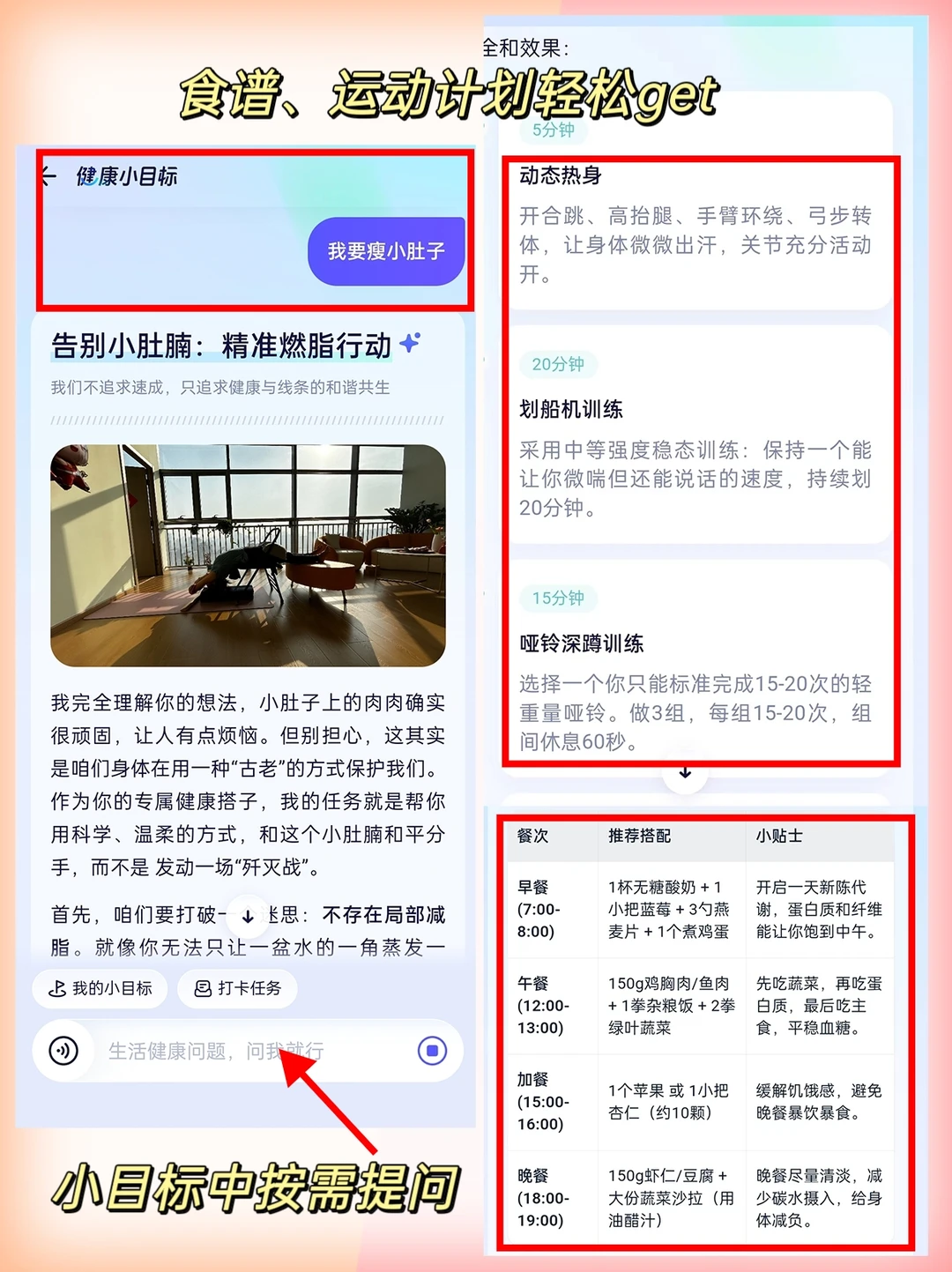姐妹们,新的一年想减肥,但又担心一个人没动力? · 给大家分享我的减肥搭子“阿福”,我已经用阿福制定好了专属我的减脂新年小目标啦,26年减脂之路不再孤单了~ · 我的使用心得分享给大家: ✅ 定制专属计划 在「健康小目标」里问“我想瘦小肚子”,阿福就能给可参考的饮食搭配和运动思路,省去了盲目搜索的麻烦。它会根据我的情况量身定制,不用再照搬别人的计划,不适合自己又难坚持。 · ✅ 分解健康目标 阿福还有个细节,它不会列一个很唬人的计划,而是把计划拆解成每天容易完成的小任务。 它规划了三餐饮食摄入量1700大卡,还给了运动小任务,每天哑铃深蹲10次、划船机20分钟。 每天打卡特别有成就感!它还会像朋友一样温柔提醒我,再也不怕因为忙而忘记啦。 · ✅ “拍一拍”食物 如果每餐都自己计算卡路里,麻烦不说还容易有误差,现在我会用阿福随手拍下,它能识别并分析营养信息。我再也不用自己苦苦计算了,每天该吃什么、吃多少一目了然! · 以前一个人减肥很容易中途放弃,有了阿福就像多了个靠谱的减肥搭子,它不仅仅是陪伴,还能给到很多专业指导和鼓励。 · 如果你也在找有耐心、能实时陪伴的健康生活小助手,真的可以试试阿福,让它陪你一起,轻松开启新一年的健康旅程吧!
